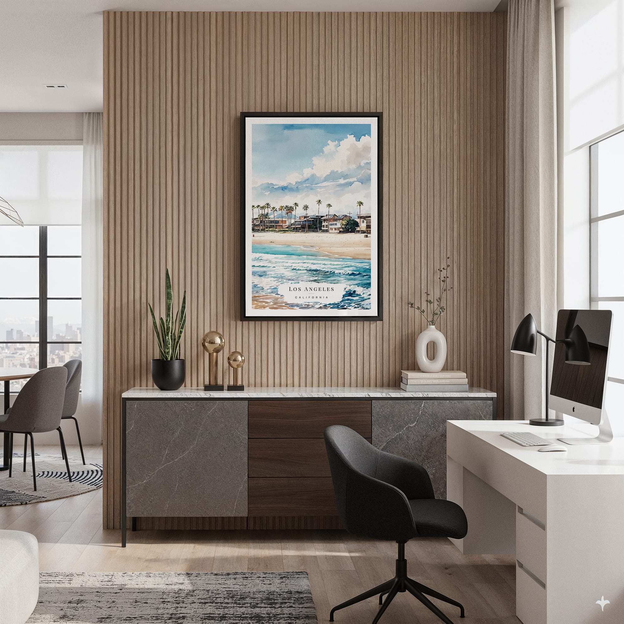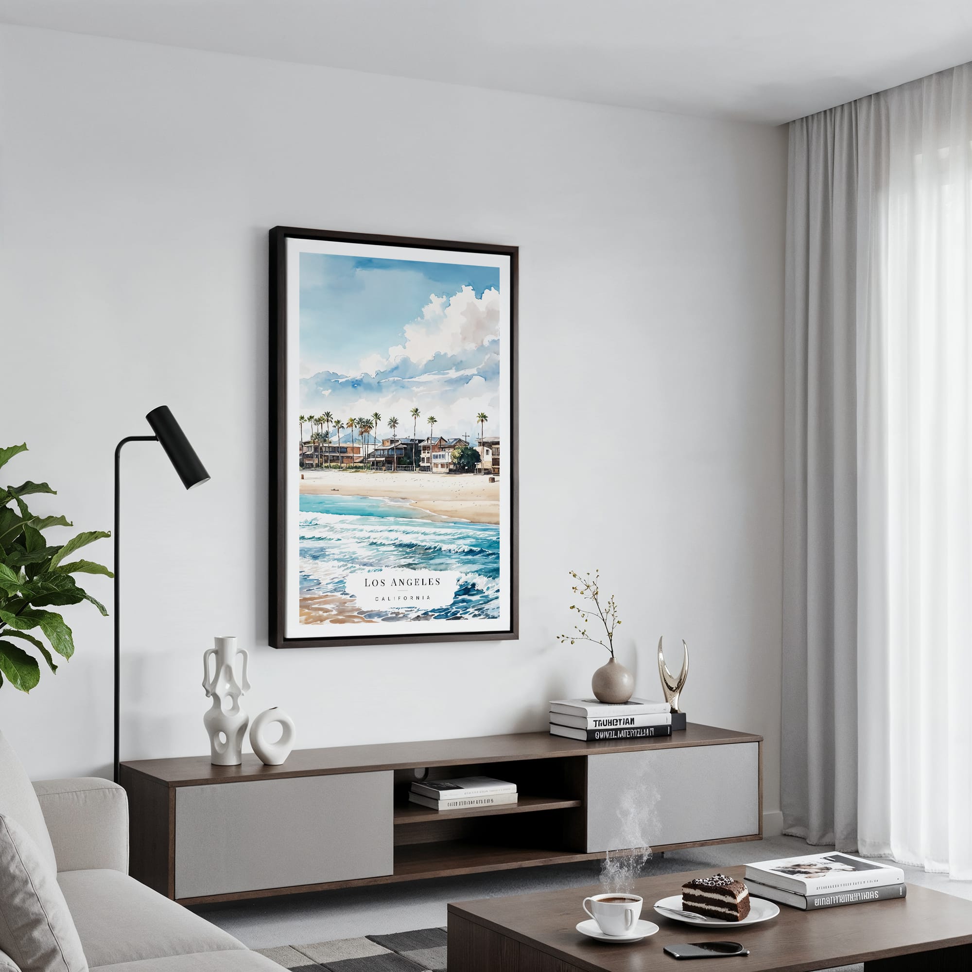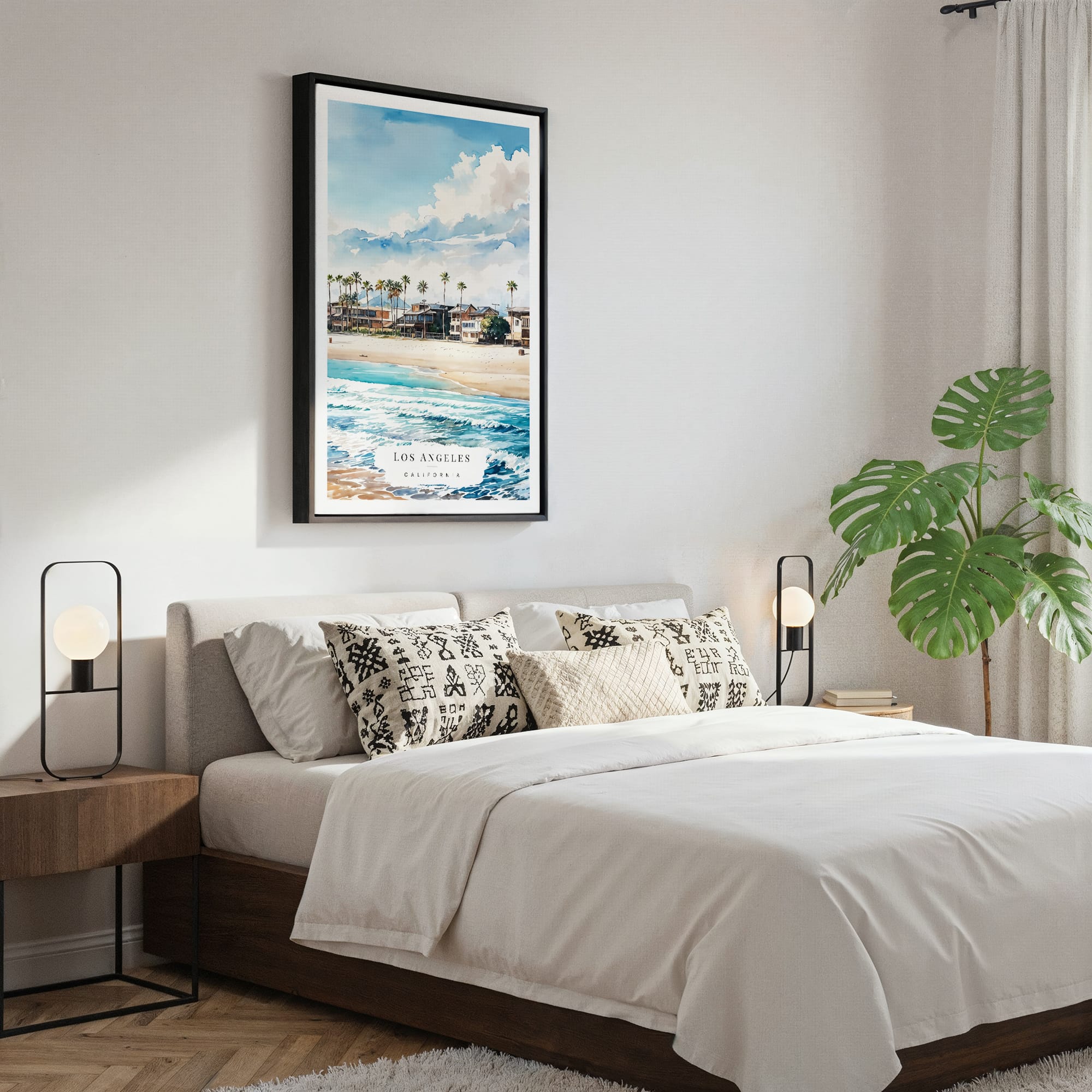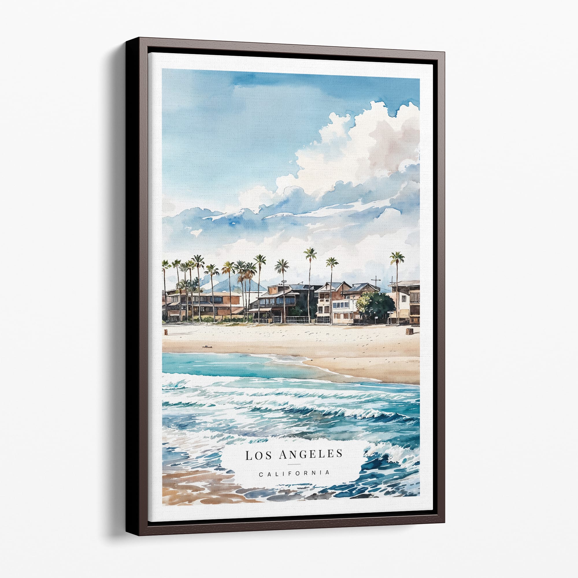 Los Angeles Waterfront Homes Watercolor Canvas Print – Bright Coastal Scene Wall Art