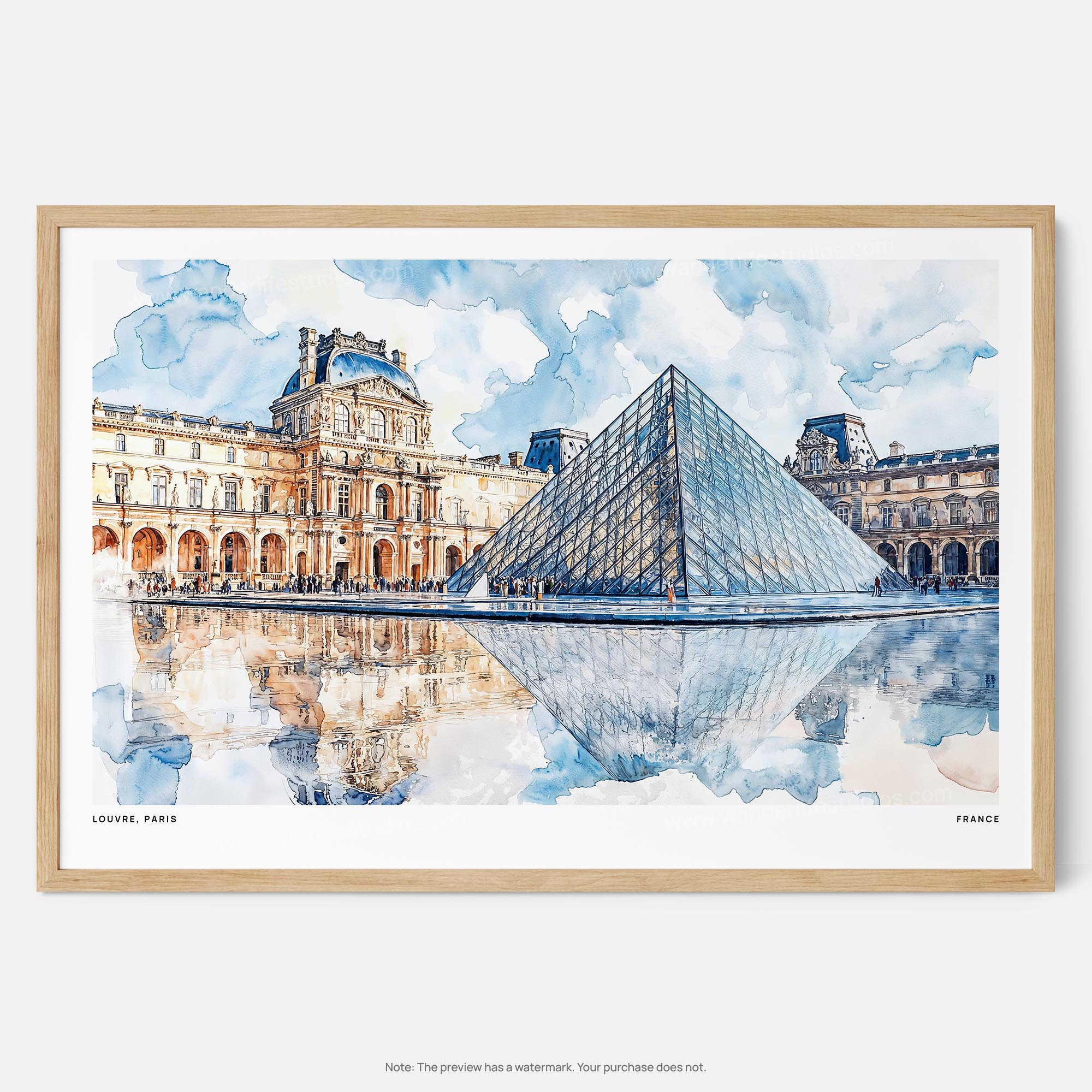Elevate your space with this watercolor art print of the Louvre, capturing the iconic architecture and serene reflections. Perfect for your living room or as a thoughtful gift for art lovers.