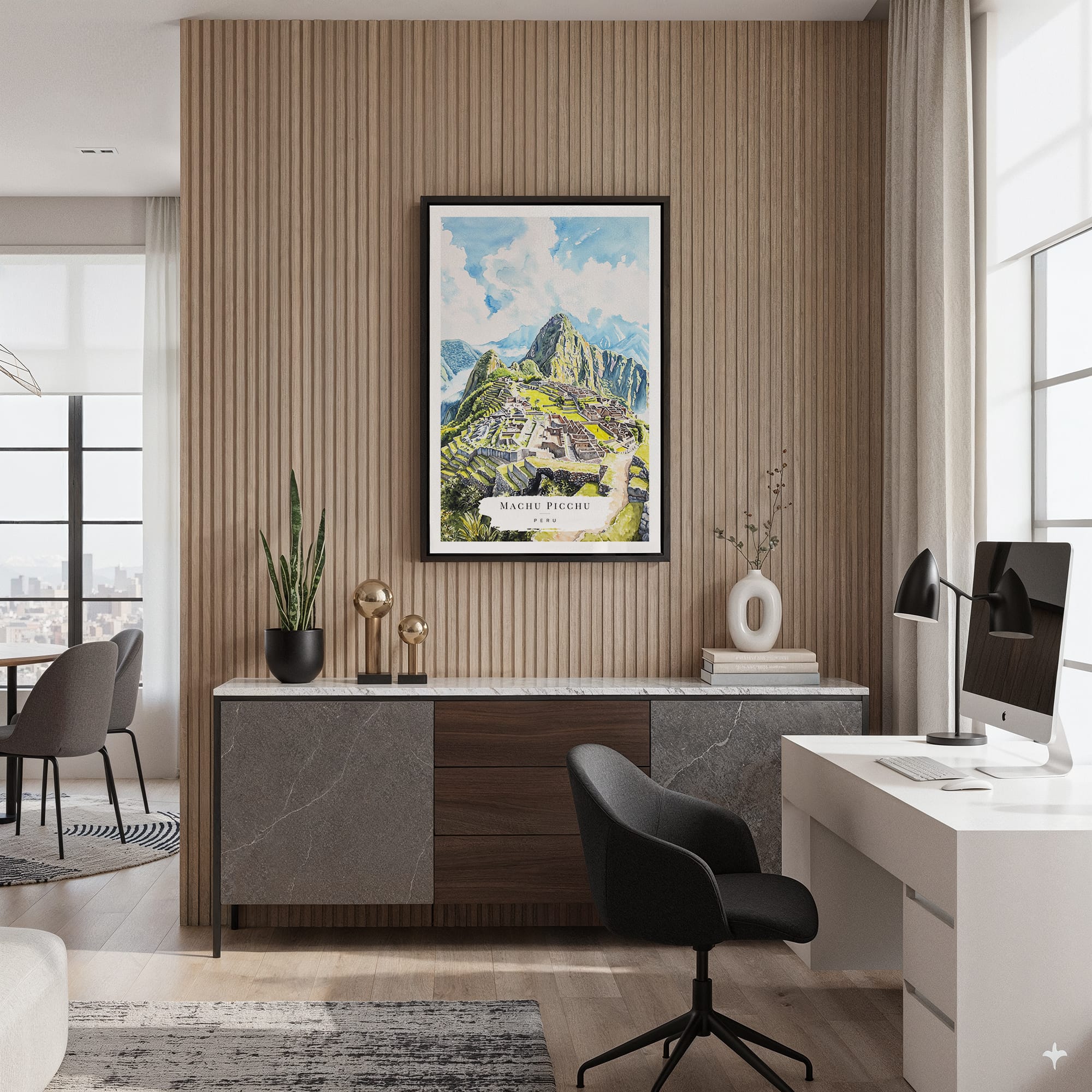 Transform your wall with this Machu Picchu watercolor canvas art print. Featuring lush greens and soft blues, it adds a touch of Peruvian charm to your living room or office, making it an excellent choice for home decor.
