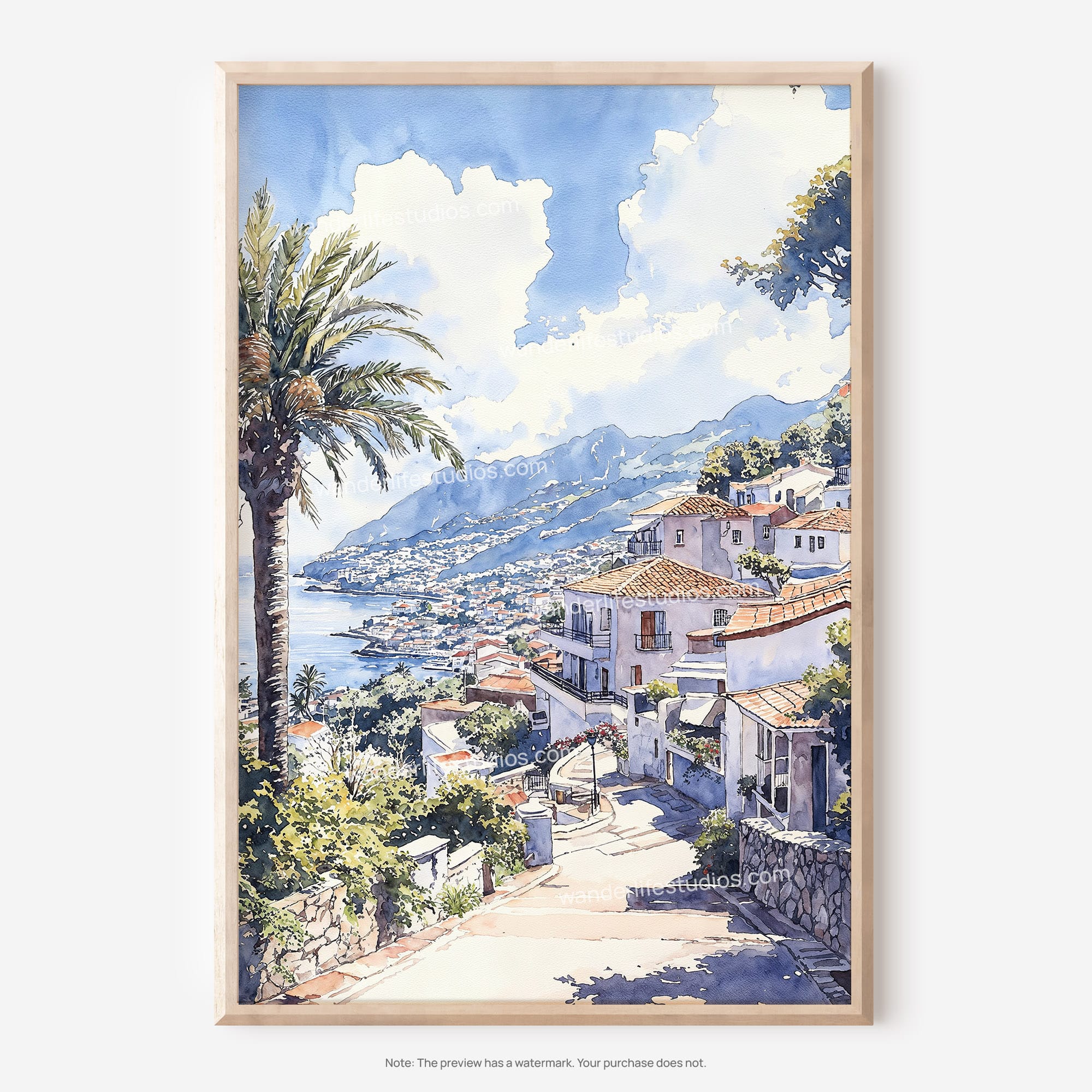 Madeira Watercolor Art Print – Serene Coastal Landscape Digital Download
