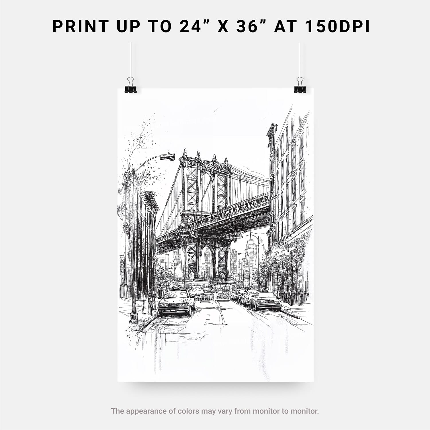 This Manhattan Bridge digital download wall art features a detailed pencil drawing that captures the essence of New York City. Enjoy the convenience of instant access and print it easily for your home or office.