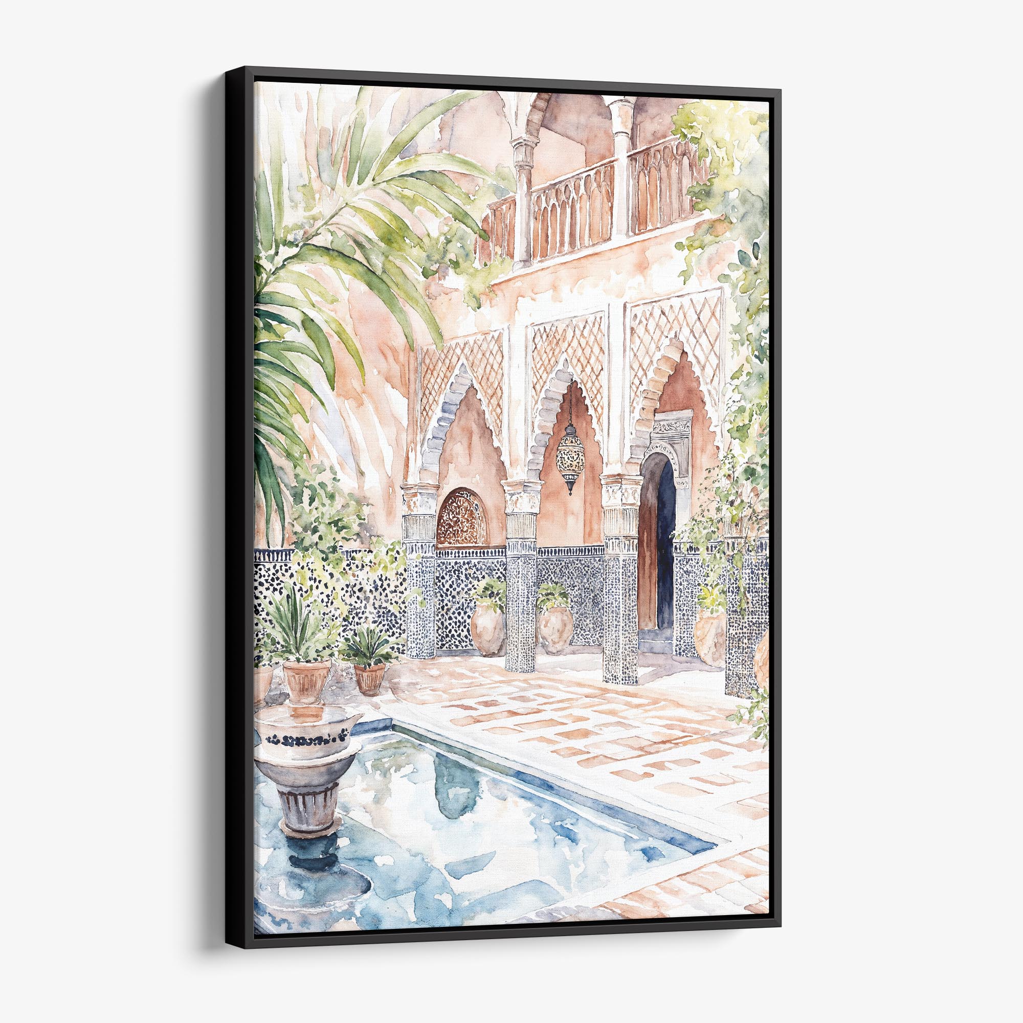 Transform your space with this watercolor canvas print of a serene Marrakesh backyard. Ready to hang, it’s ideal for living rooms, home offices, or any spot that calls for a touch of tranquility.