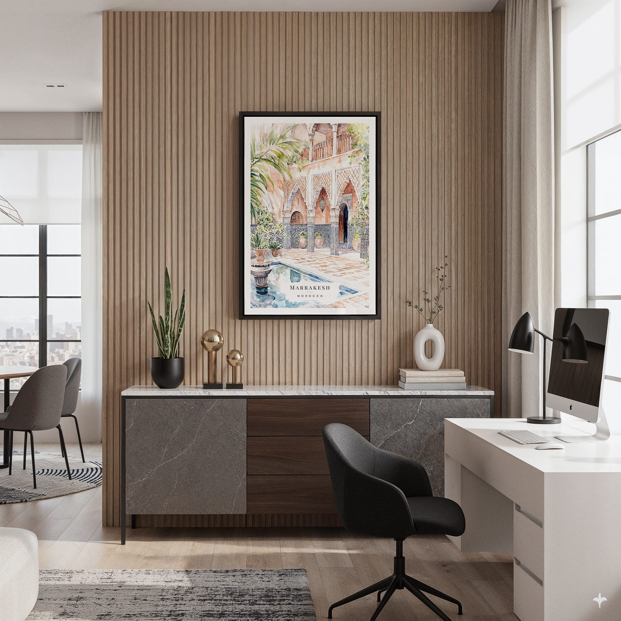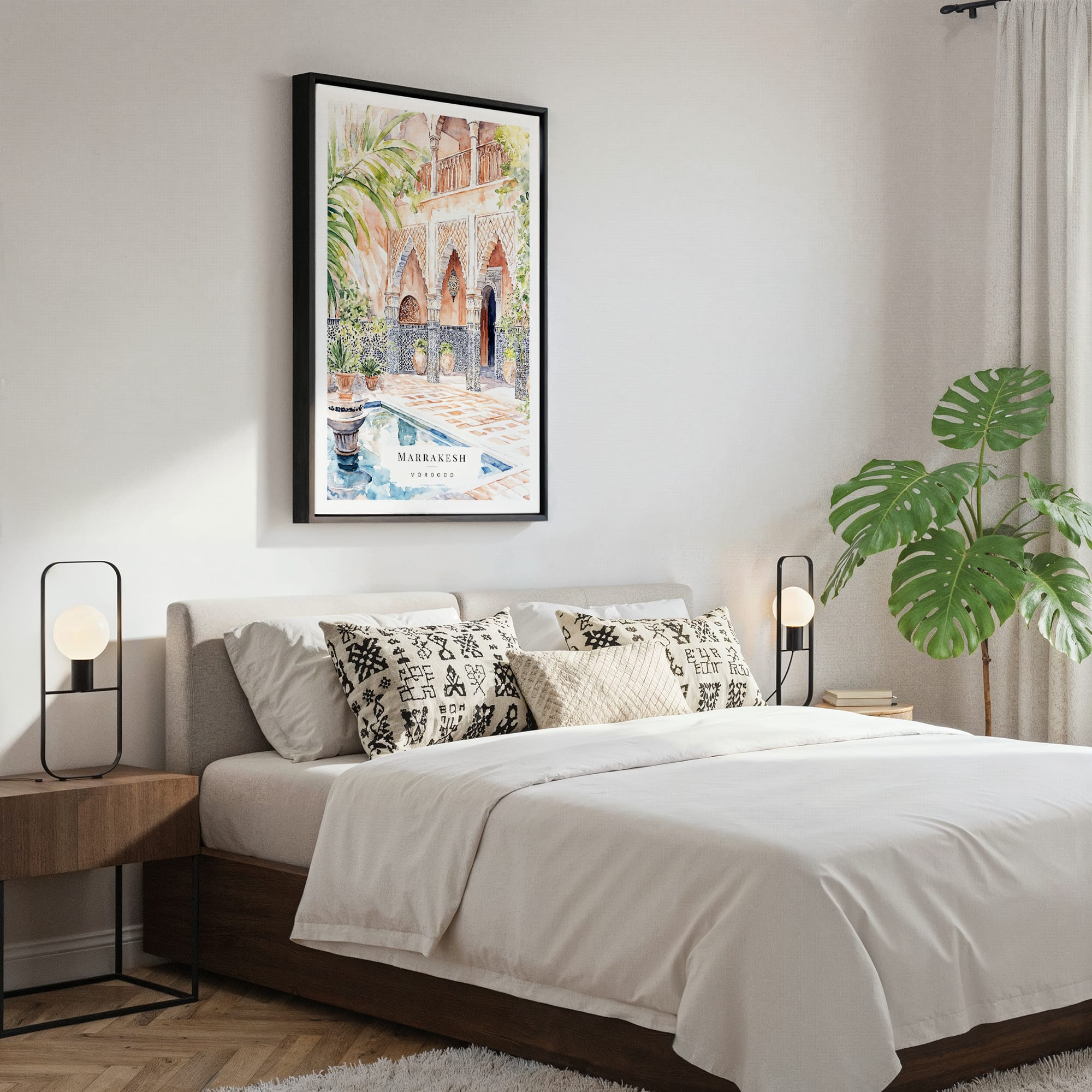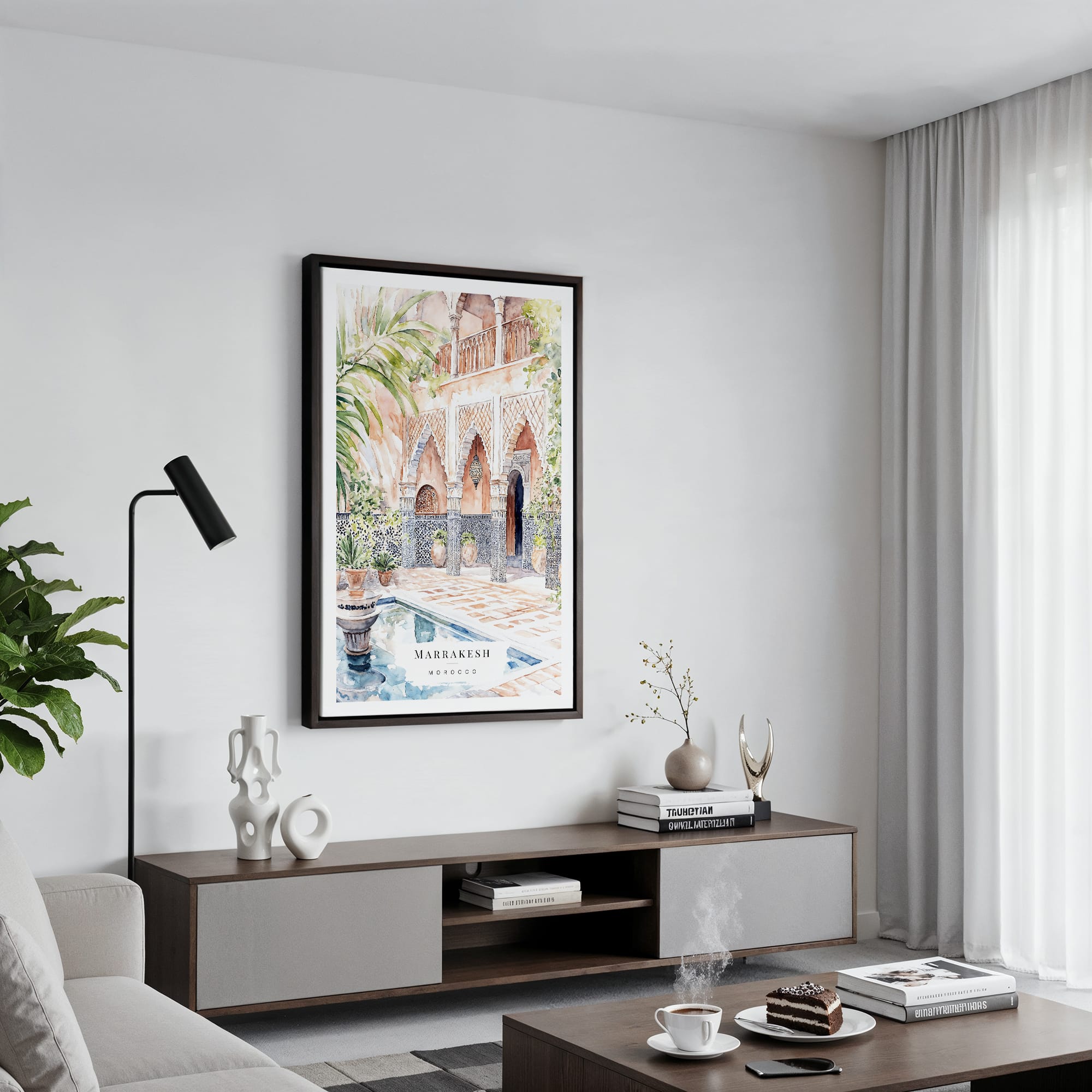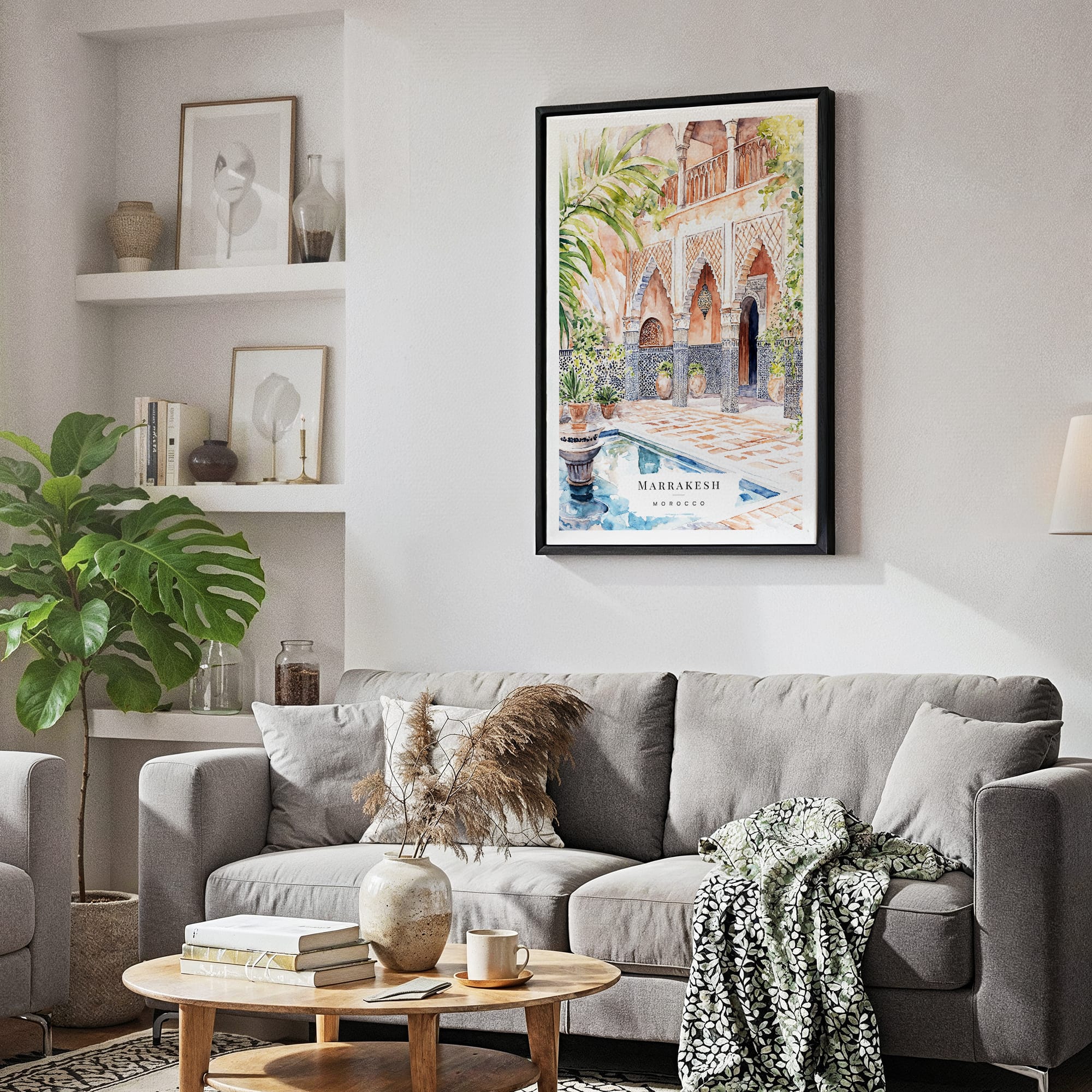 This artwork captures the enchanting atmosphere of Marrakesh, showcasing vibrant architecture and lush greenery in soft watercolor hues. It brings a warm, inviting feel to any room, making it ideal for modern, cozy spaces. Printed on a sturdy canvas with fade-resistant inks, it arrives ready to hang, providing a delightful update for your home or a thoughtful gift for someone who appreciates exotic decor.
