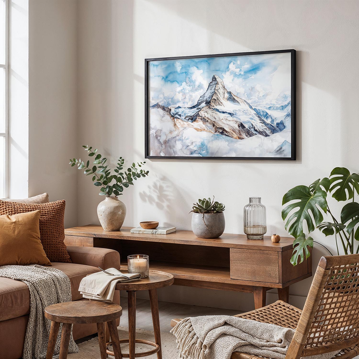 Experience the iconic Matterhorn in this beautifully crafted watercolor art print. The artwork showcases the mountain’s sharp peak surrounded by a dramatic sky, evoking feelings of adventure and tranquility.