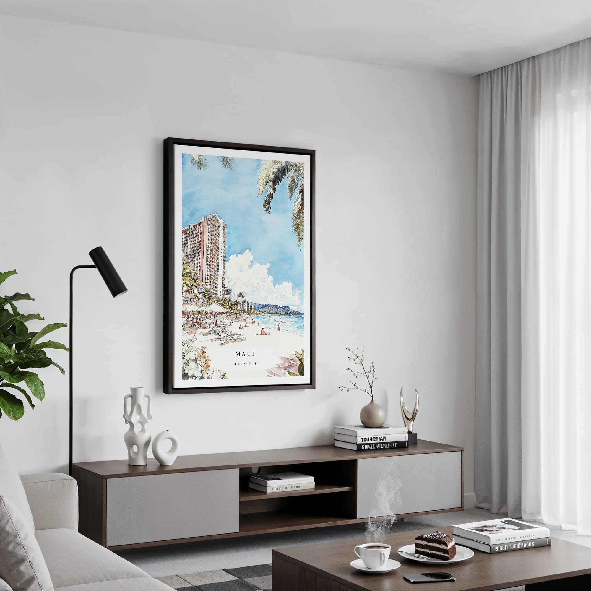 Transform your space with this Maui watercolor canvas art print, showcasing a vibrant beach scene. The warm colors and relaxed vibe create an inviting ambiance, making it perfect for any room in your home or as a thoughtful gift.