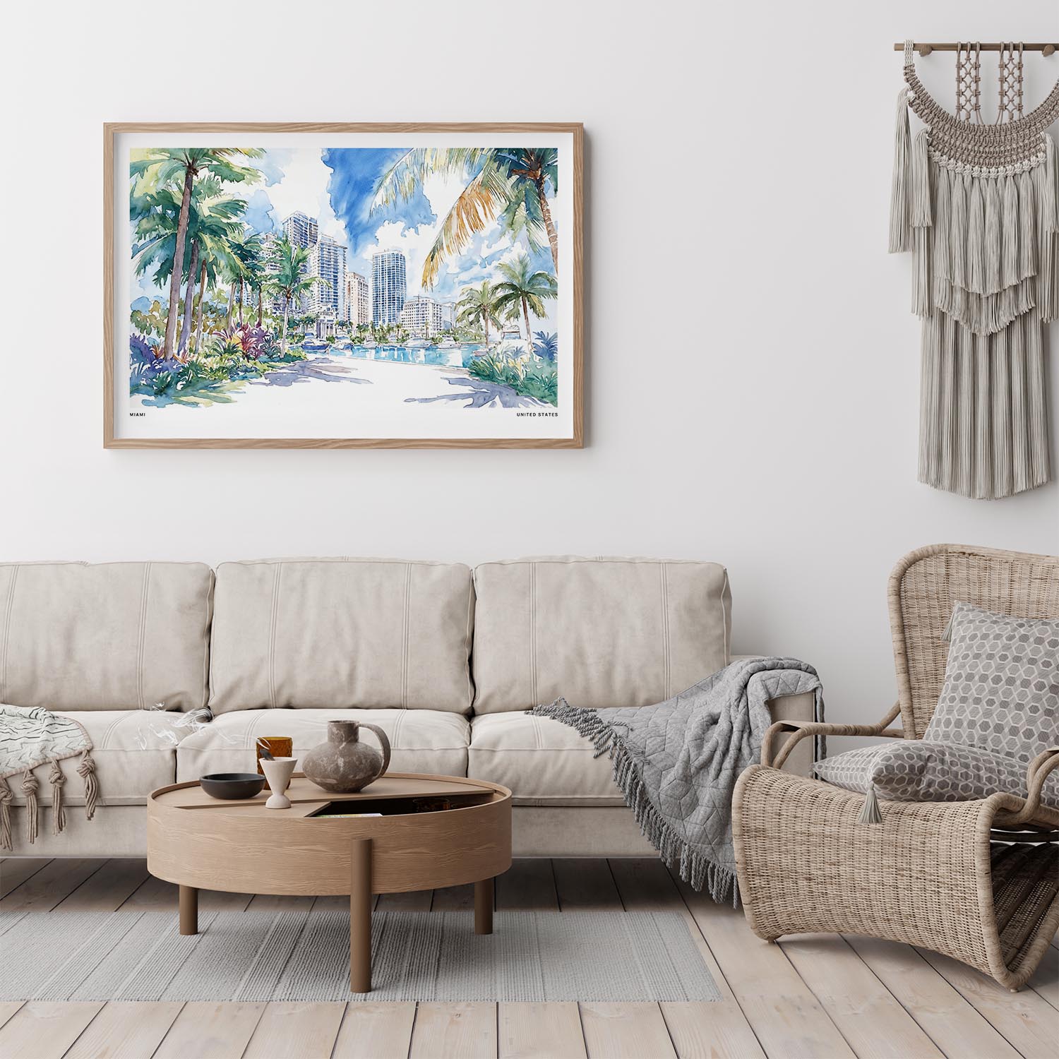 Give your space a touch of vibrant Miami with this watercolor art print. Featuring a lively cityscape surrounded by lush palm trees, it’s perfect for brightening up your living room, bedroom, or office.