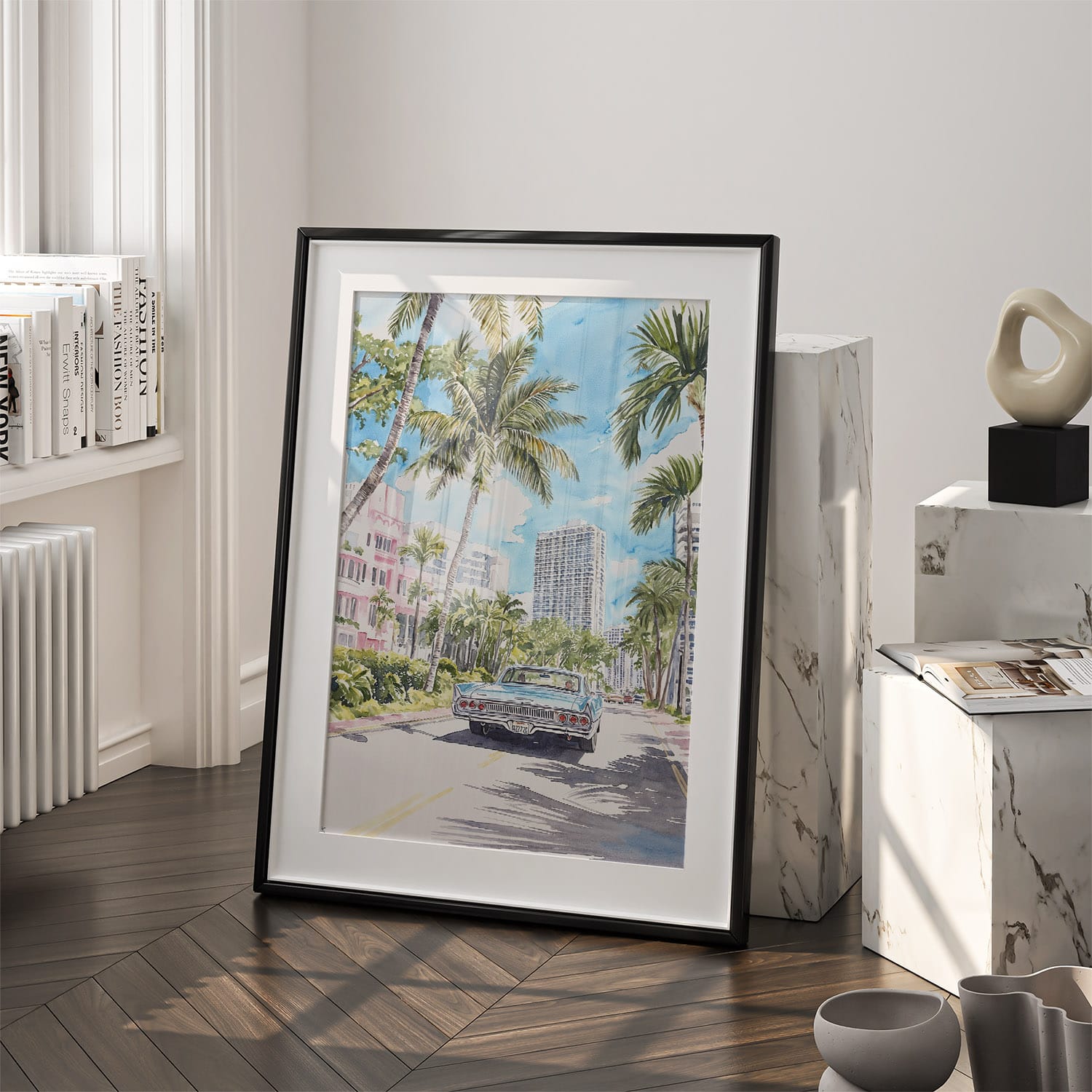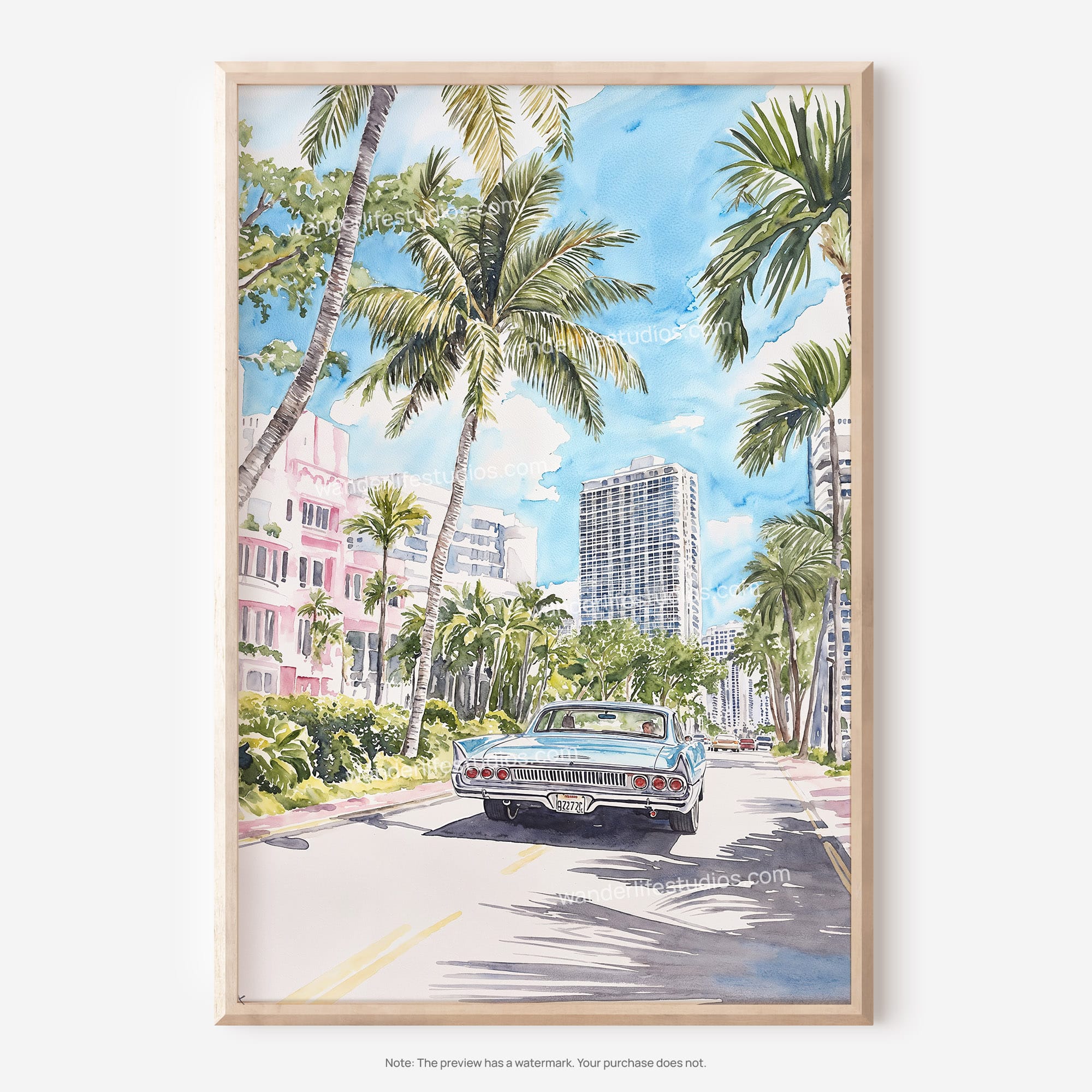 Capture the vibrant spirit of Miami with this watercolor wall art featuring a vintage car amid palm trees. Enjoy instant access to print at home or a local shop for a quick decor update.