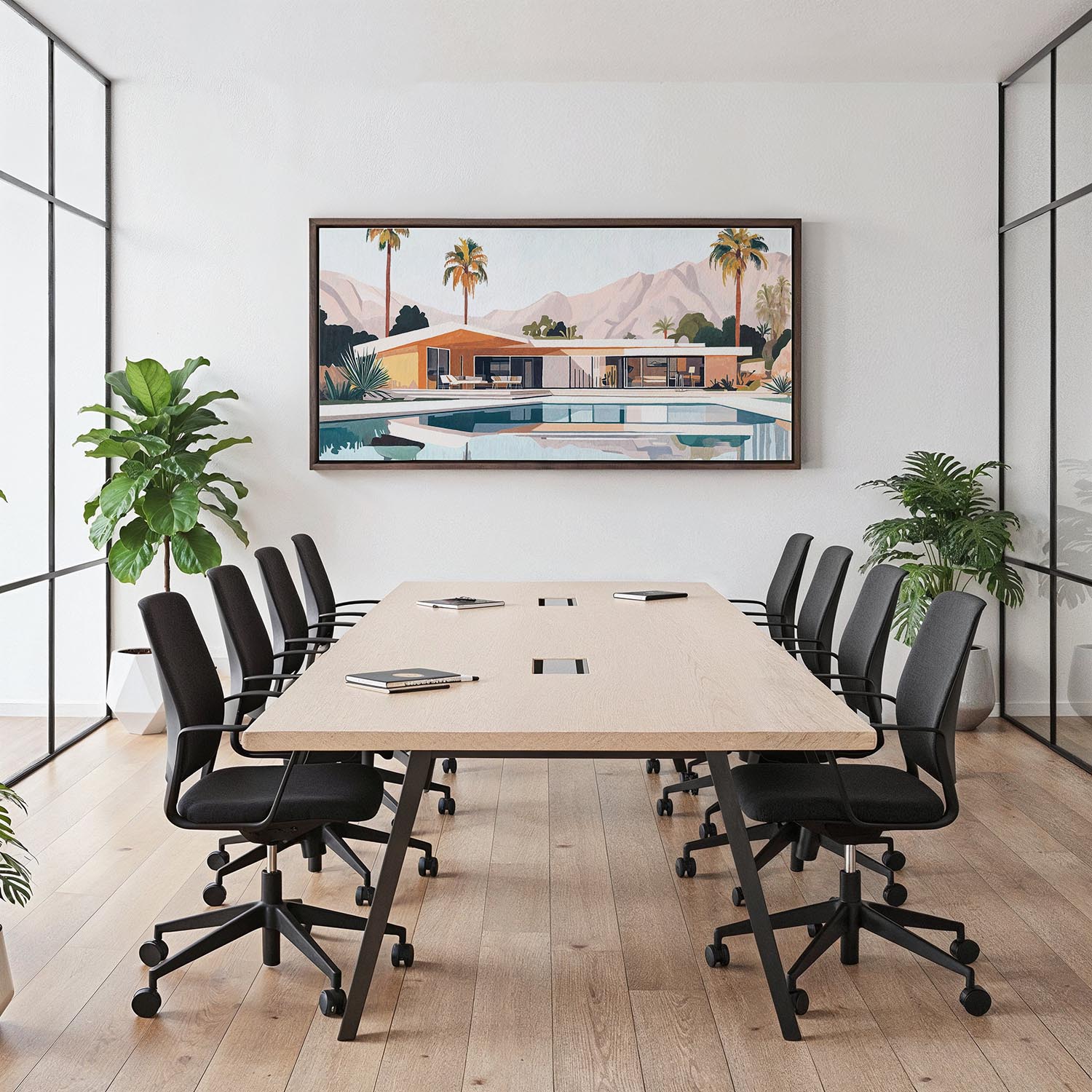 Transform your wall with this Midcentury Palm Springs panorama canvas print. The vast desert landscape and modern architecture create a calming focal point, perfect for living rooms, offices, or any statement wall.
