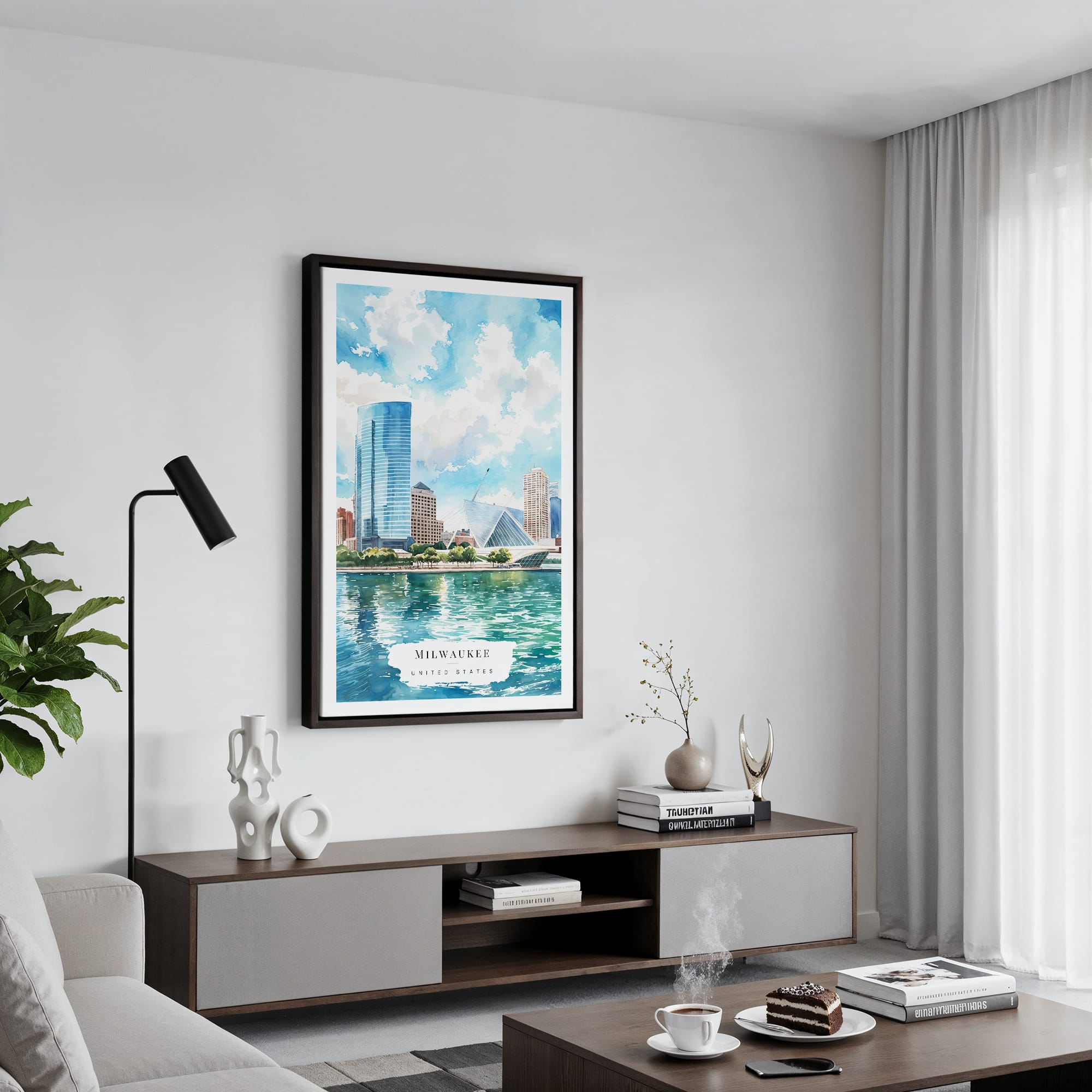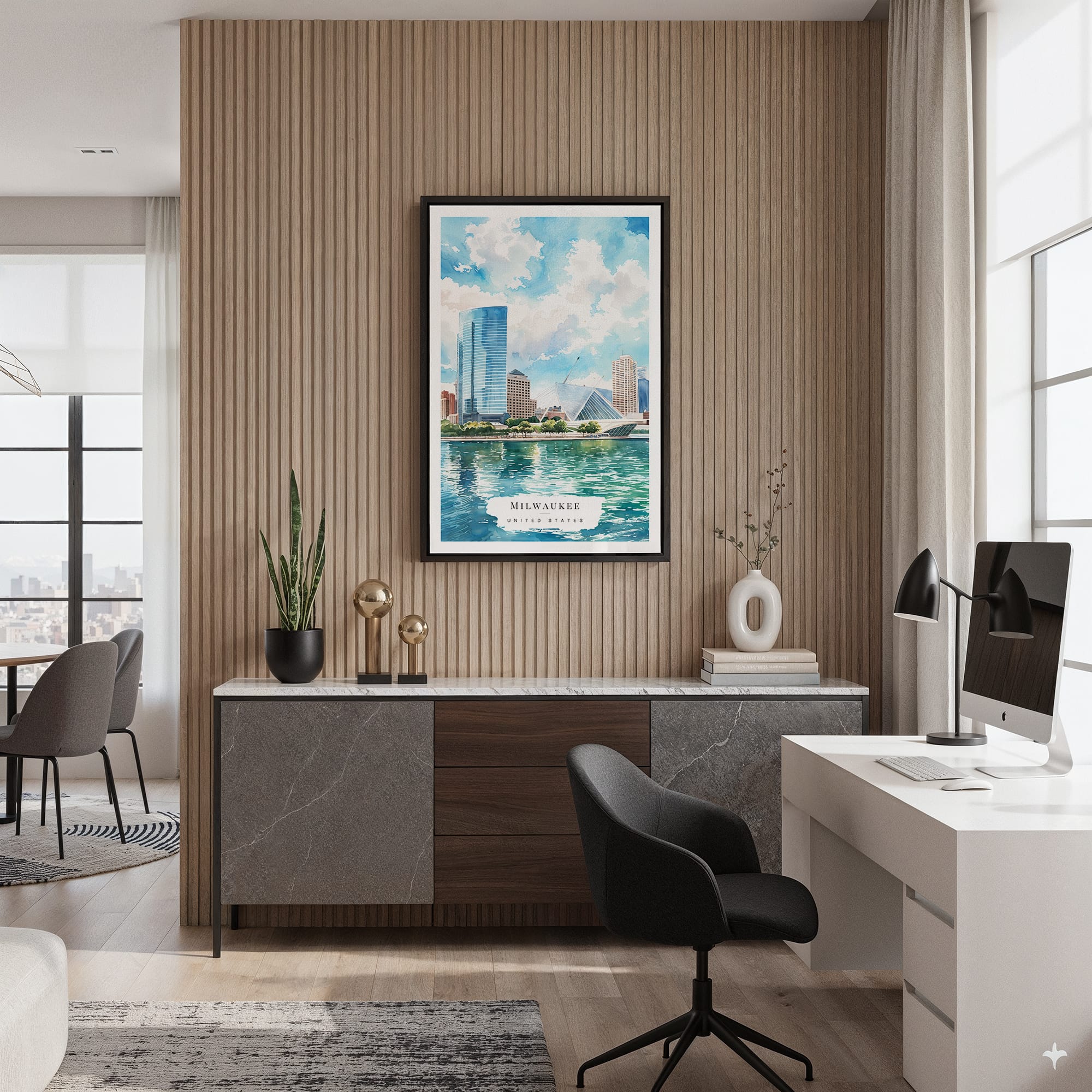 This artwork captures the essence of Milwaukee with a soft watercolor depiction of its skyline. The combination of blue and green tones brings a refreshing vibe to any setting, creating a relaxed atmosphere. Crafted on a gallery-wrapped canvas, it features fade-resistant inks and is ready to hang, making it suitable for living rooms, offices, or any personal space. It’s an inviting way to enhance your decor or to share the beauty of Milwaukee with a friend.