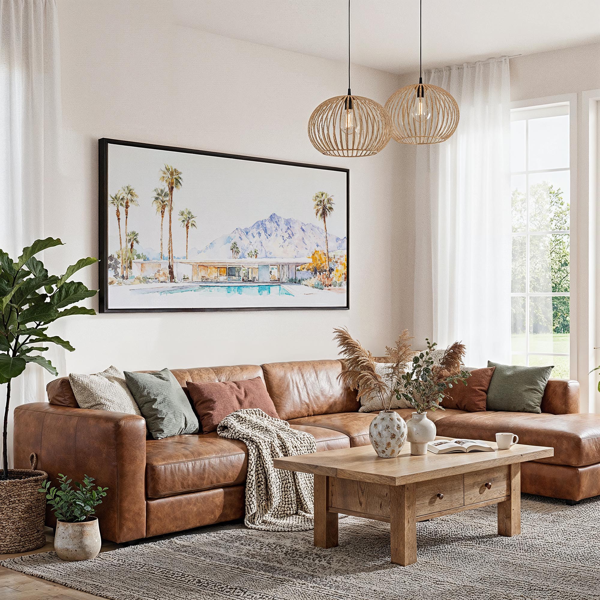 This artwork showcases the charm of Palm Springs with its soft watercolor palette featuring swaying palms and distant mountains. The expansive 2:1 panoramic format brings a sense of tranquility and openness to your walls. Crafted in the United States on hand-stretched canvas, it uses fade-resistant inks and boasts a matte finish, ensuring it’s ready to hang right away. Perfect for above sofas, in hallways, or professional spaces, it makes a thoughtful gift or a delightful addition to your own collection.