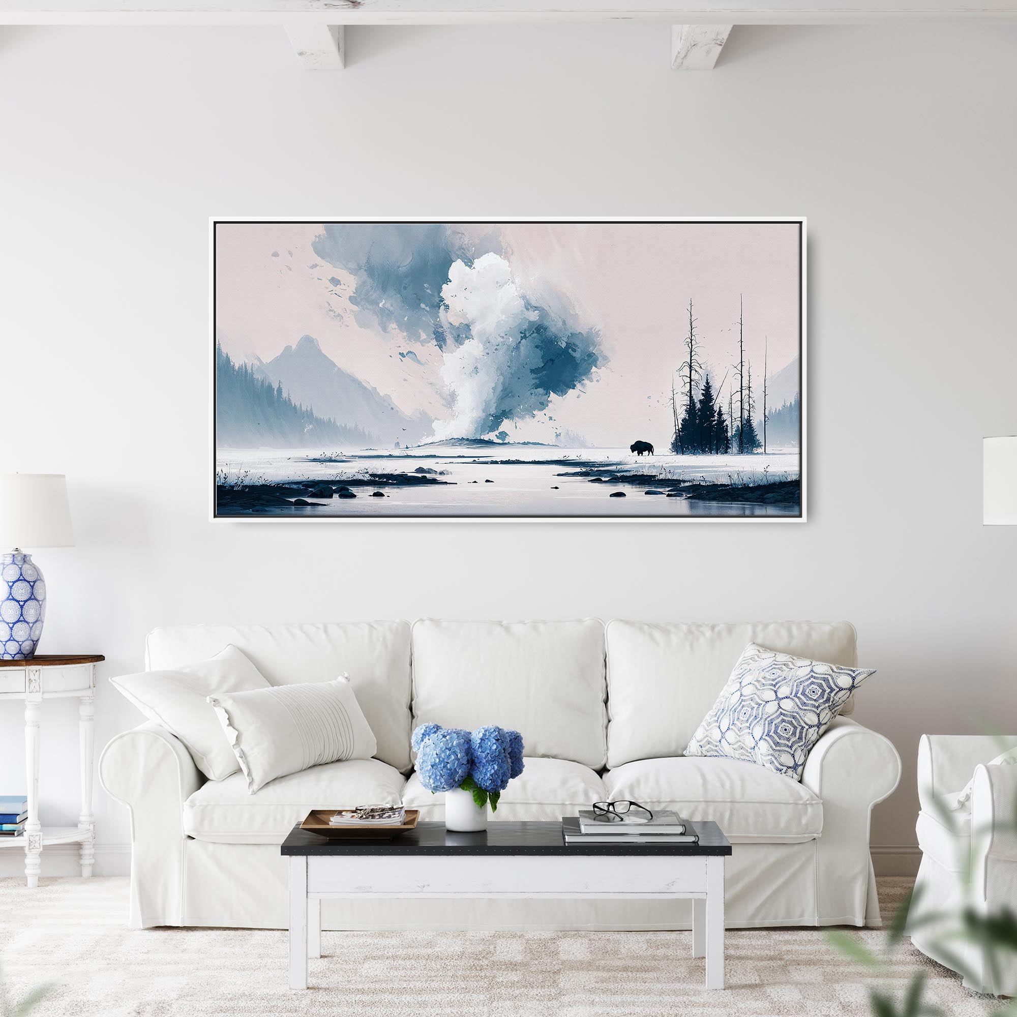 Minimal Yellowstone Watercolor Panorama Canvas Print – Tranquil Landscape Wall Art