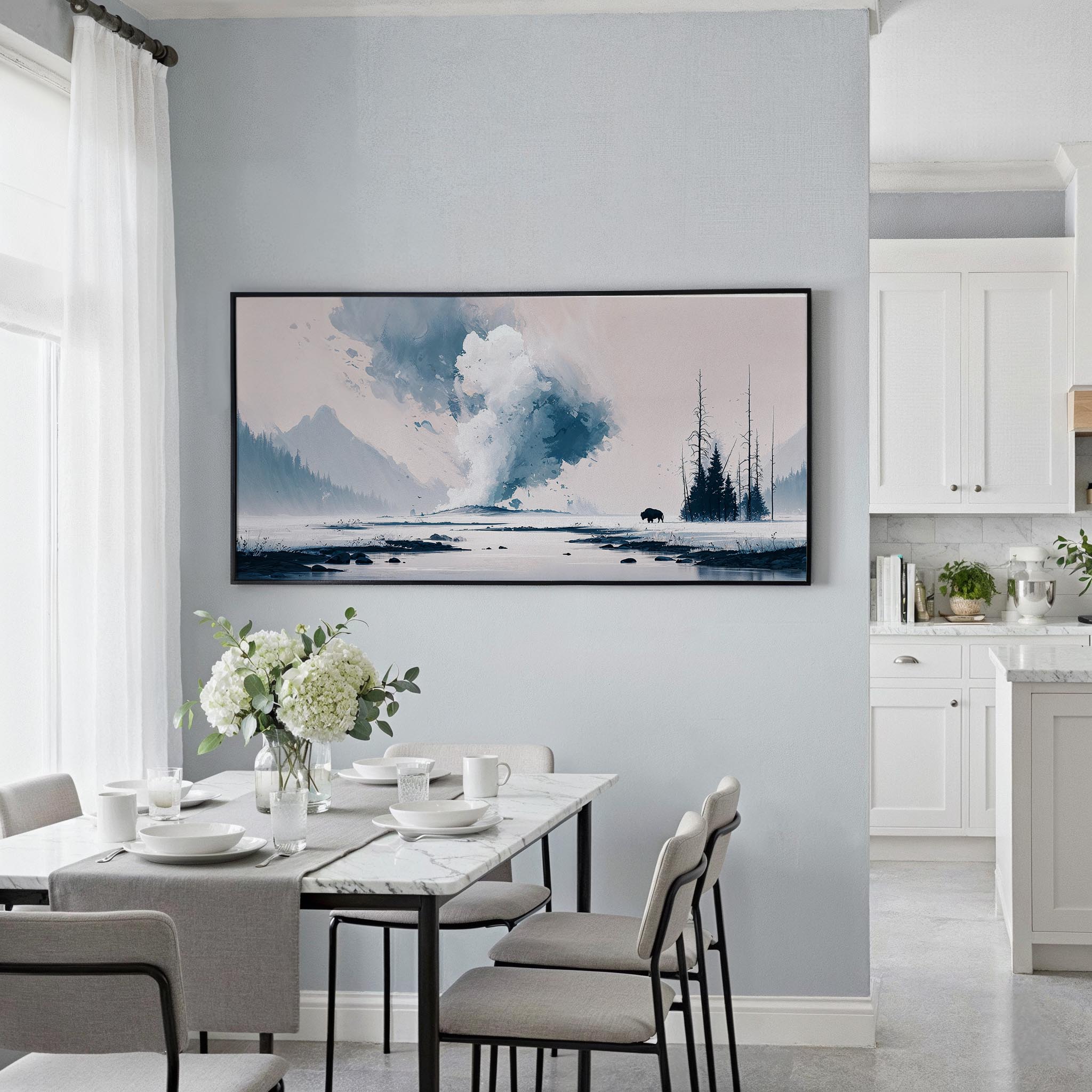 Transform your space with this striking panorama canvas print of Yellowstone. The expansive design showcases soft hues of water and mountains, making it a perfect centerpiece for living rooms or offices.