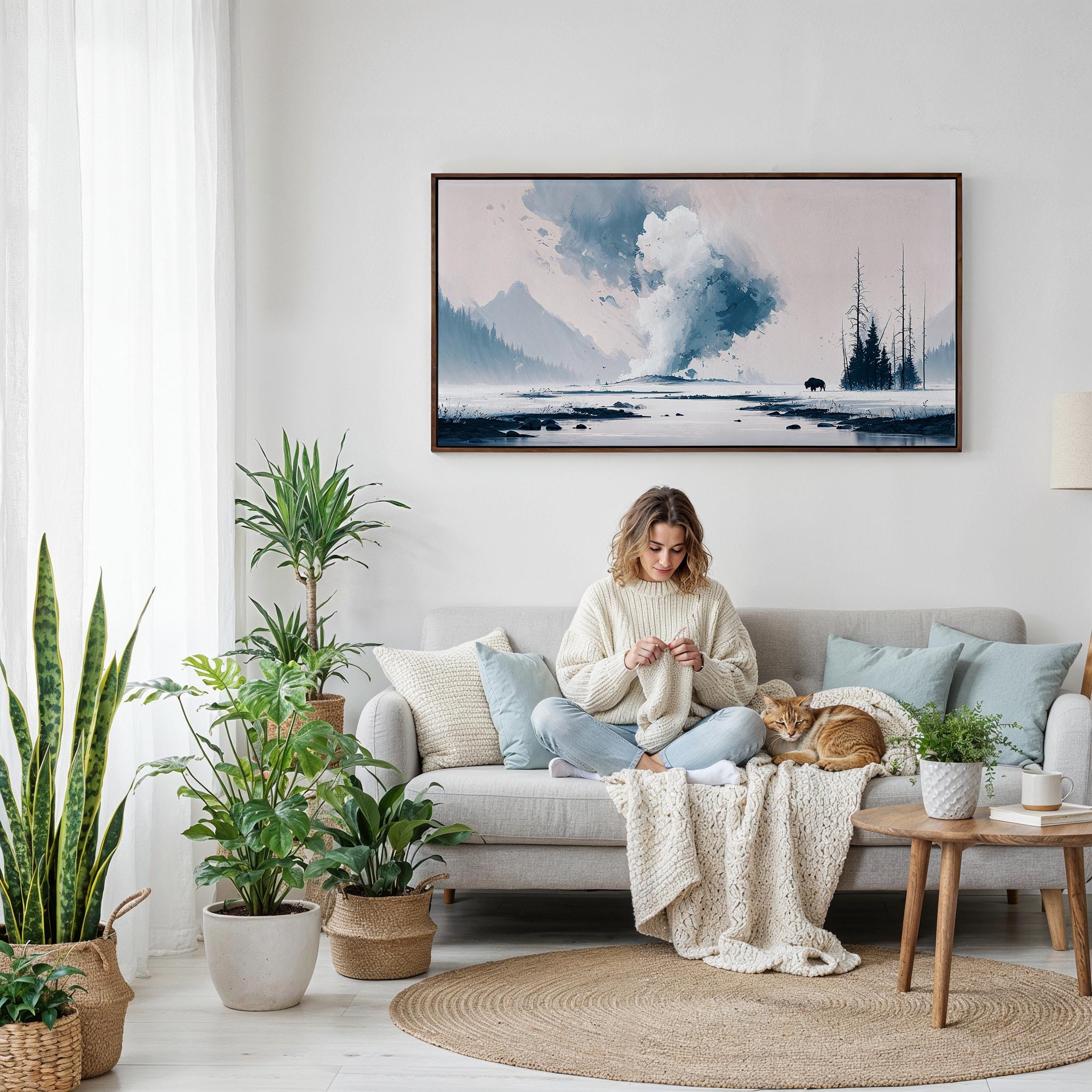 Capture the essence of Yellowstone with this watercolor panorama that reflects the park’s serene waters and majestic mountains. The wide 2:1 aspect ratio enhances the feeling of openness, bringing a calming presence to your walls. Crafted in the United States, this premium canvas is made with fade-resistant inks, a matte finish, and solid wood stretcher bars, ensuring it’s ready to hang and built with sustainability in mind. It’s an ideal addition above a sofa, in hallways, or in office spaces. A thoughtful choice for nature enthusiasts or a beautiful addition to your own collection.