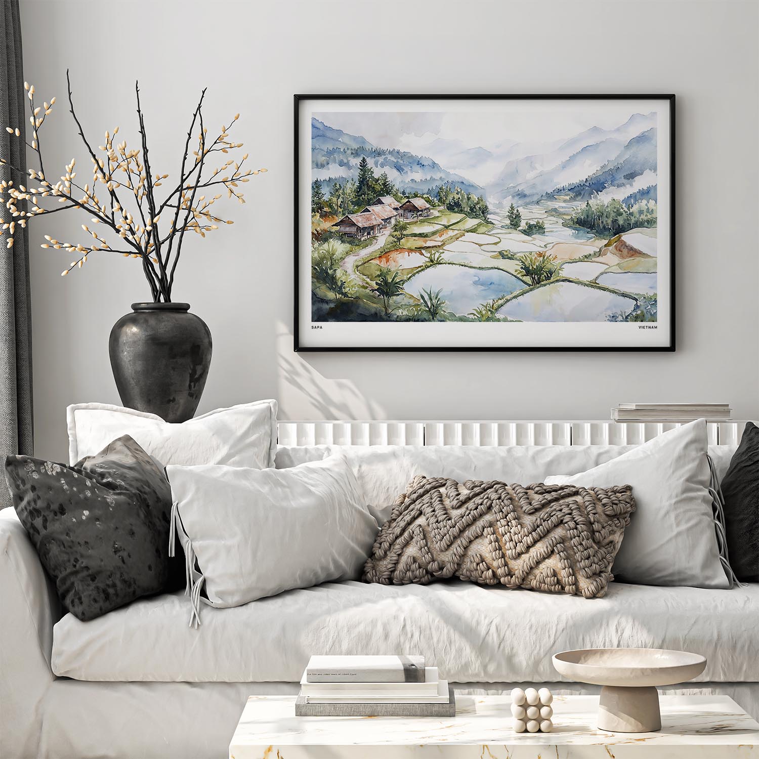 Capture the serene beauty of Sapa with this watercolor art print. The lush mountains and rice terraces create a calm atmosphere, perfect for your living room or office.