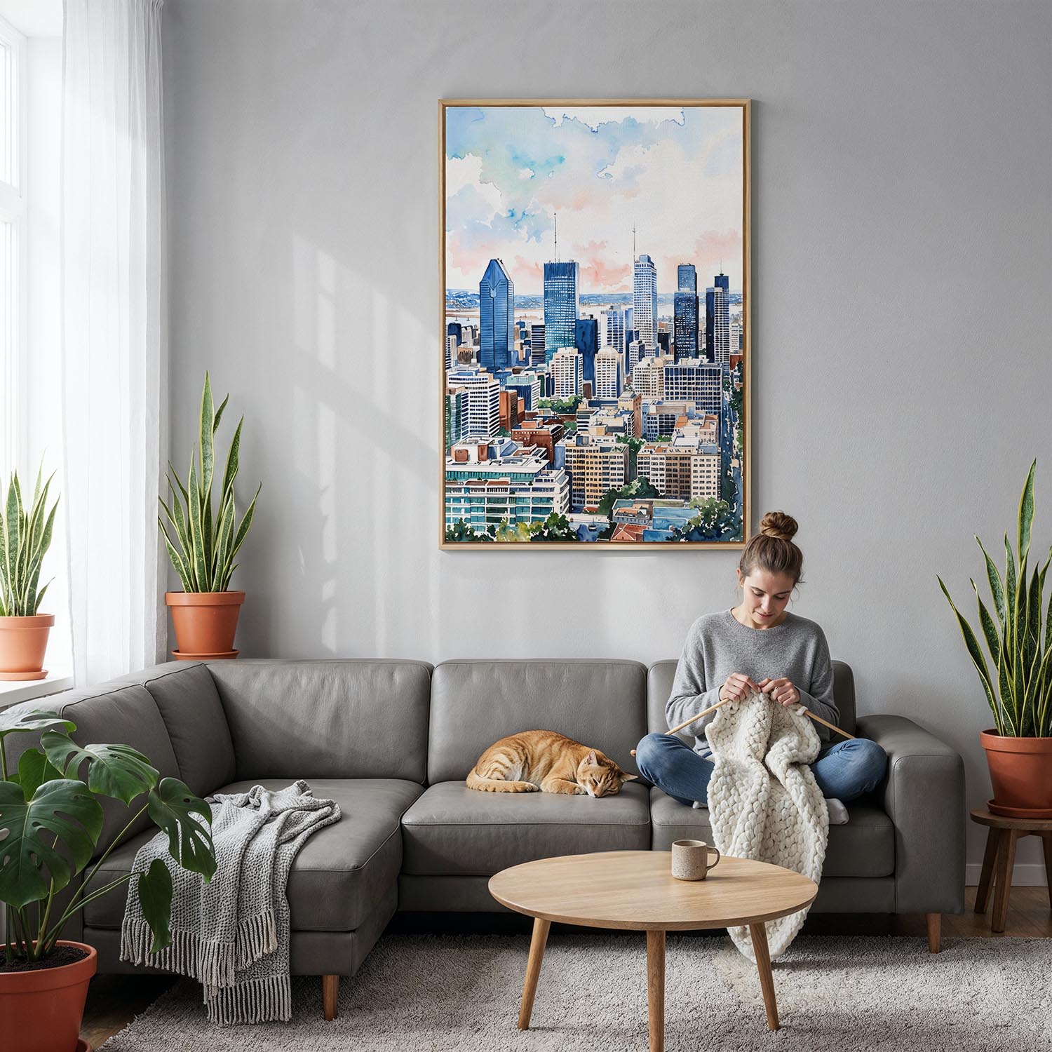 This canvas print brings Montreal’s vibrant skyline into your space, offering a ready-to-hang piece that fits perfectly in living rooms, offices, or bedrooms. Enjoy the city captured in soft watercolors.