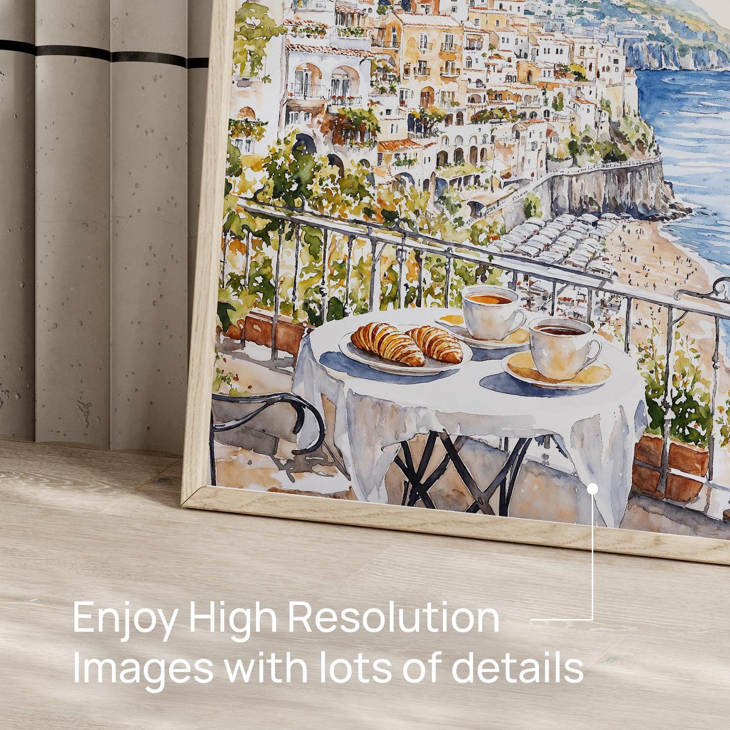 Enjoy the charm of the Amalfi Coast with this watercolor digital download wall art. Featuring a cozy morning coffee scene, it’s perfect for instant printing and transforming your space with a warm, inviting feel.