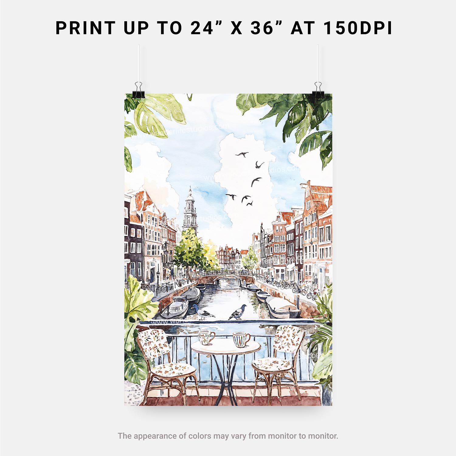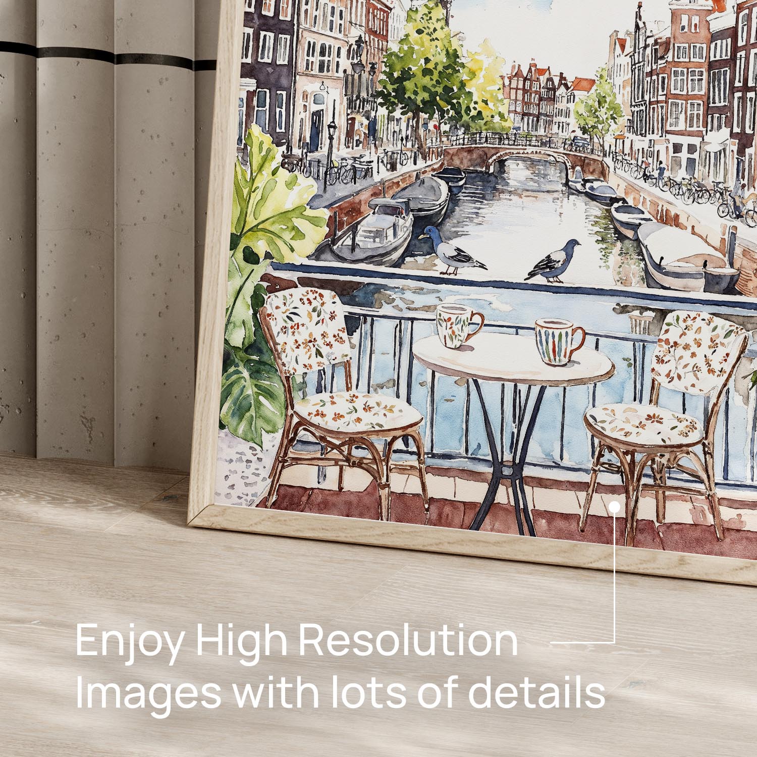 Morning Coffee in Amsterdam Watercolor Art – Digital Download