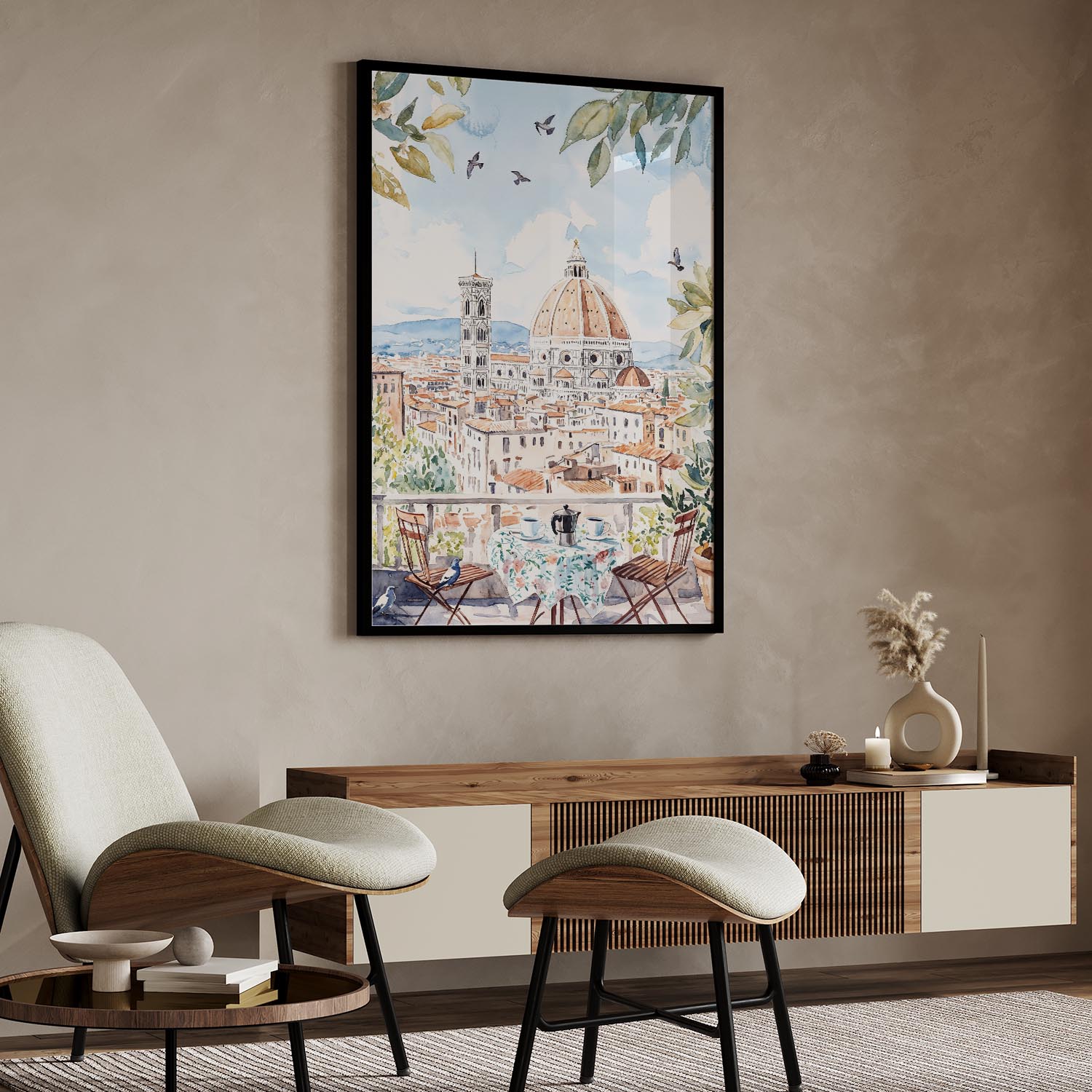 Enjoy a charming morning scene with this Florence watercolor art digital download. Featuring a cozy table setting with a view of the iconic dome, it’s perfect for instant printing in any space.