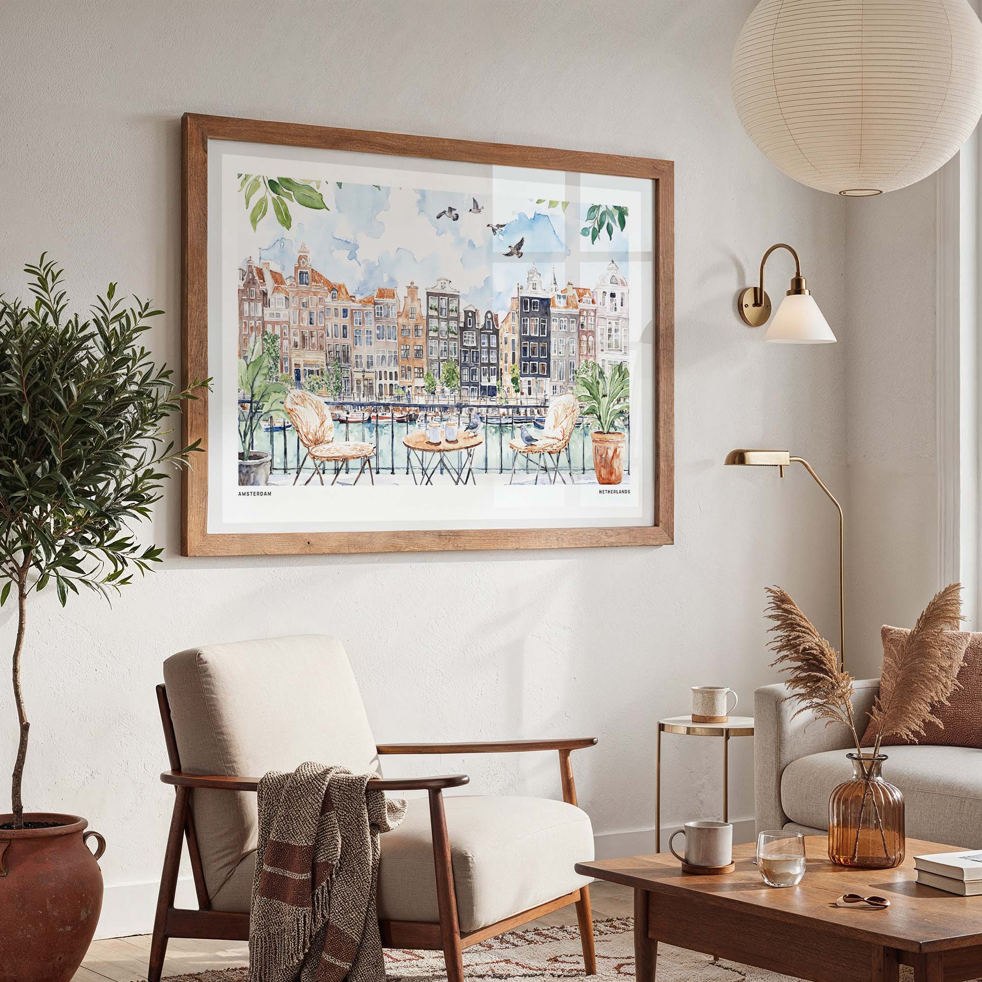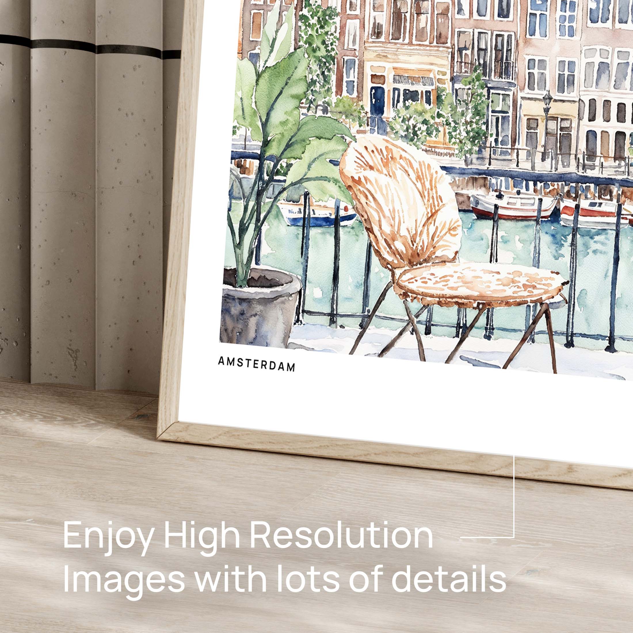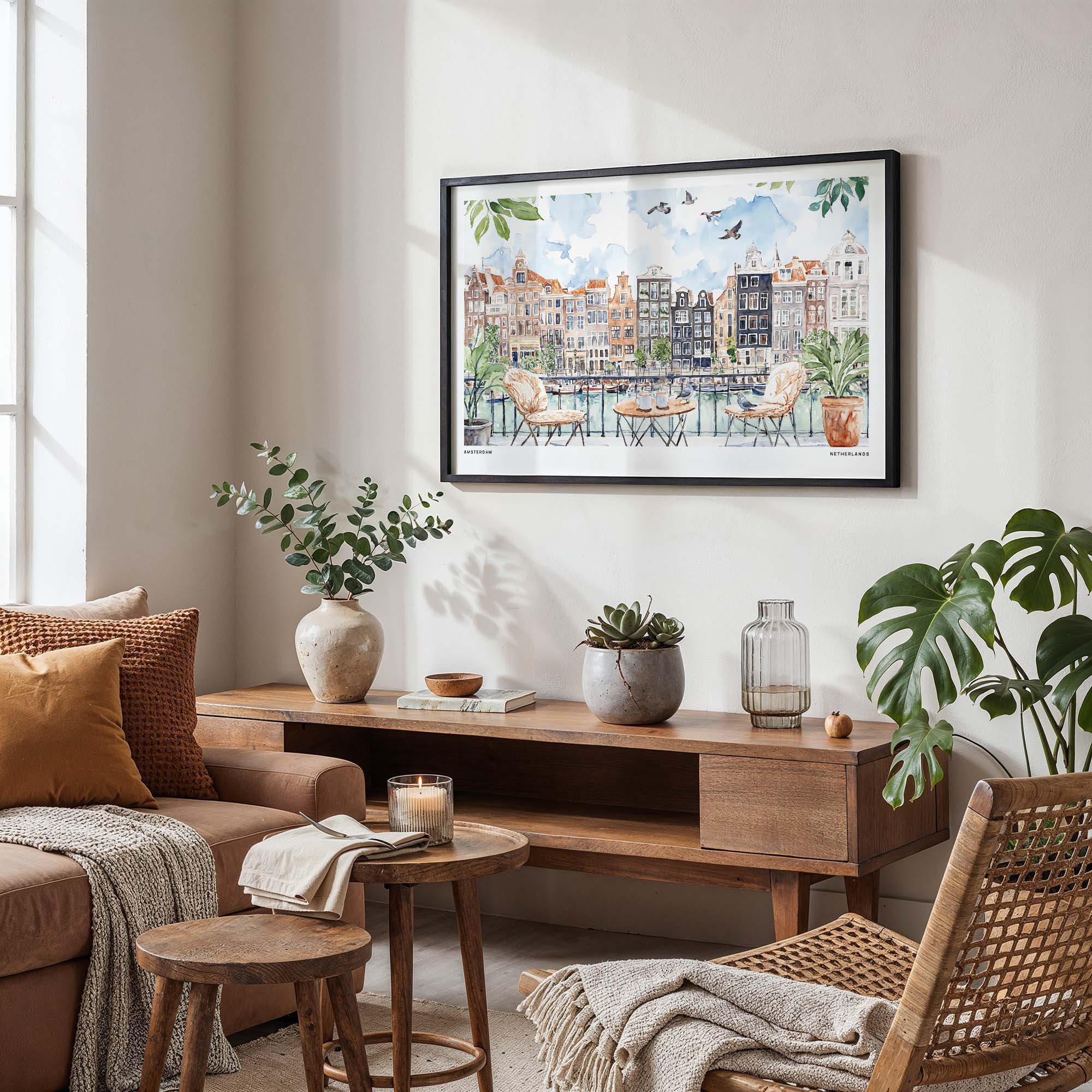 This Amsterdam watercolor art print captures a cozy riverside scene, perfect for bringing a touch of charm to your space. Download instantly and print at home or via a local shop for easy decorating.