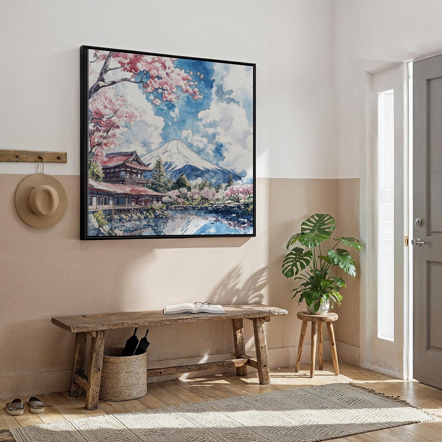 Mount Fuji Square Canvas Print | Japan Cherry Blossoms Artwork in Watercolor Style