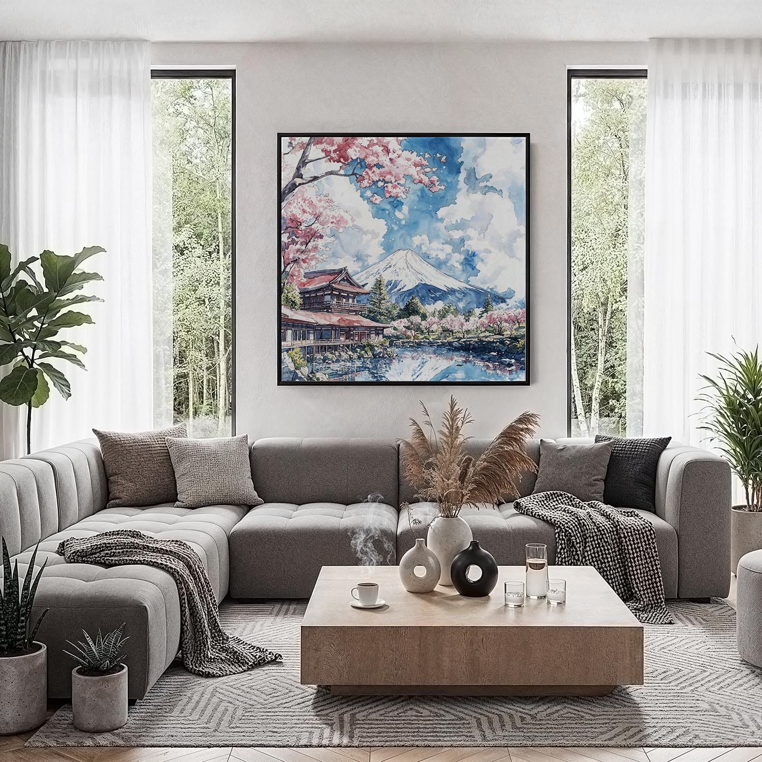 Transform your space with this Mount Fuji square canvas print featuring blossoming cherry trees and a serene lake in Japan. Its unique square shape makes it perfect for living rooms, offices, or statement walls.