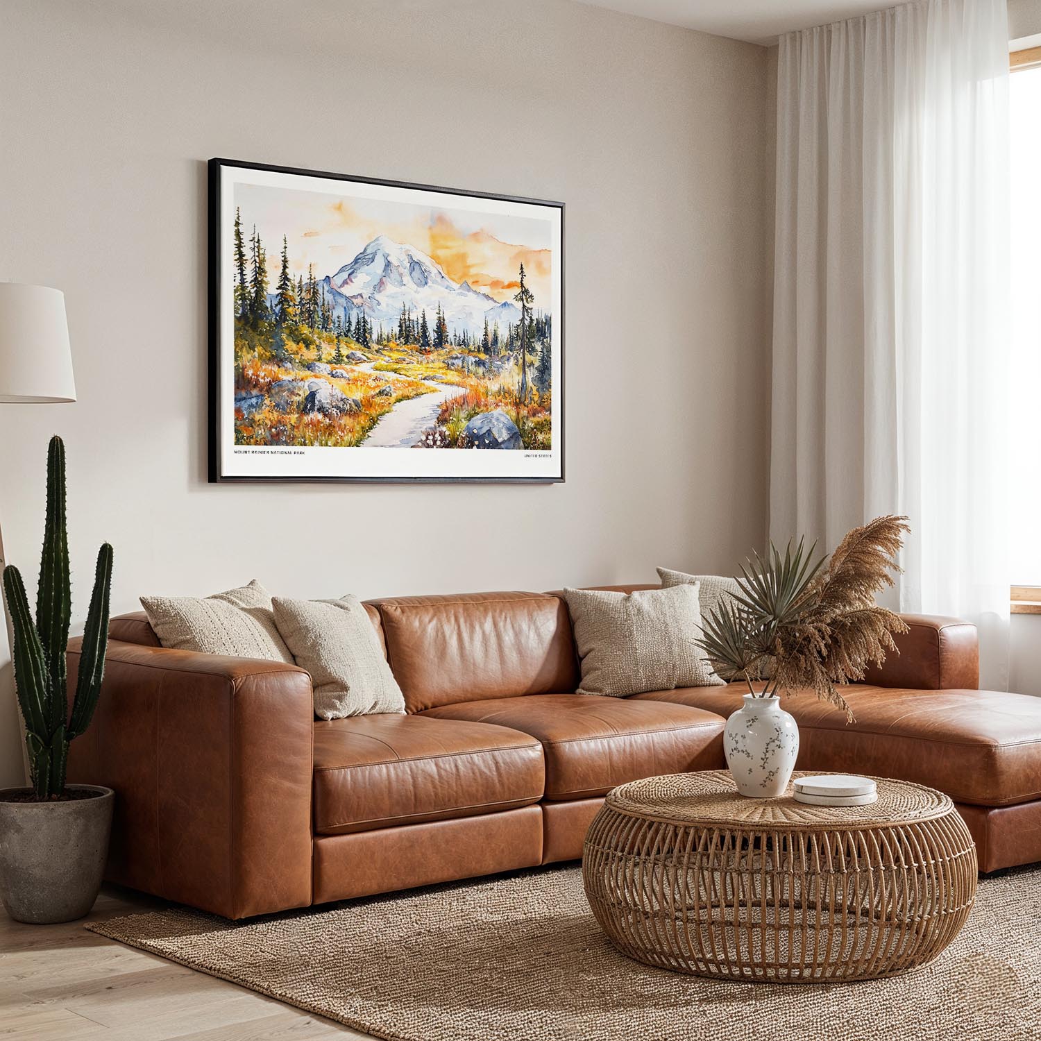Bring the tranquil beauty of Mount Rainier National Park into your home with this watercolor canvas print. A ready-to-hang piece, it makes an inviting addition to any living room, bedroom, or workspace.