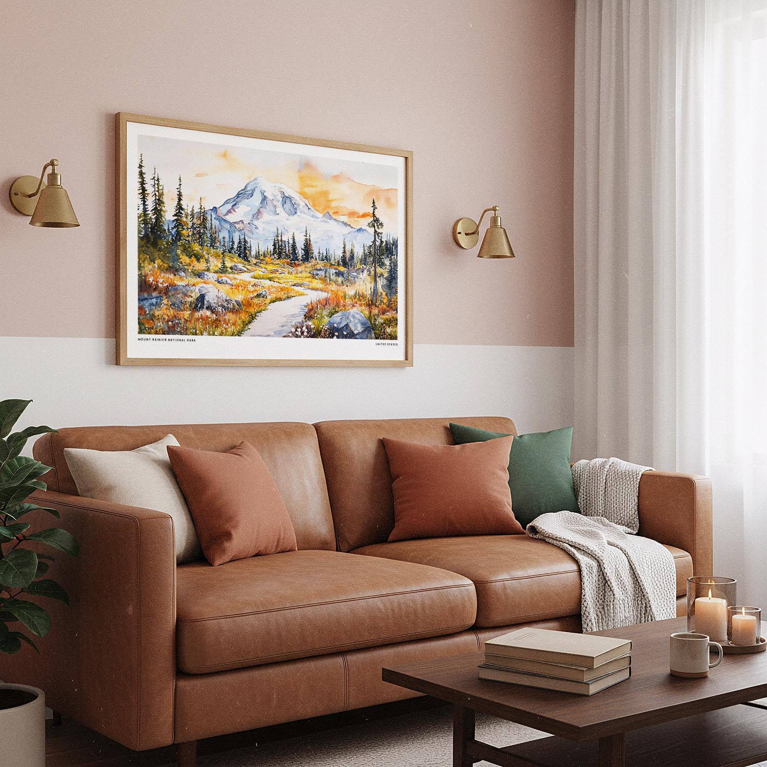 This artwork beautifully depicts the serene landscape of Mount Rainier National Park, showcasing its towering peaks and vibrant wildflowers. The warm colors and soft brushstrokes create an inviting atmosphere, perfect for any living room or study. Ideal for those who appreciate the outdoors, this print also makes a thoughtful gift for travel enthusiasts.
