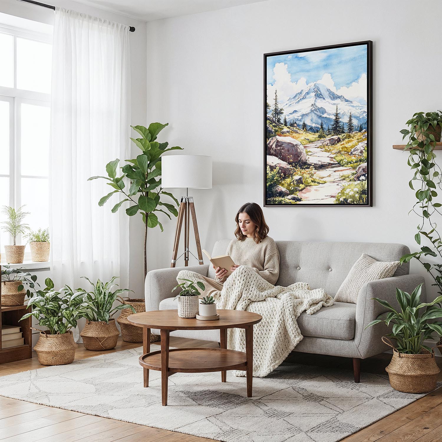 Experience the majestic allure of Mount Rainier through this captivating watercolor canvas print. It captures the peak’s snow-capped beauty and lush surroundings, creating a serene atmosphere in any setting. Available in various finishes, including unframed and floater frame options, this artwork is made with hand-stretched canvas and solid wood stretcher bars, ensuring durability. The fade-resistant inks guarantee that the colors remain vivid over time. Ideal for displaying in living rooms, hallways, or offices, this piece not only enriches your space but also serves as a thoughtful gift for nature lovers and adventurers alike.