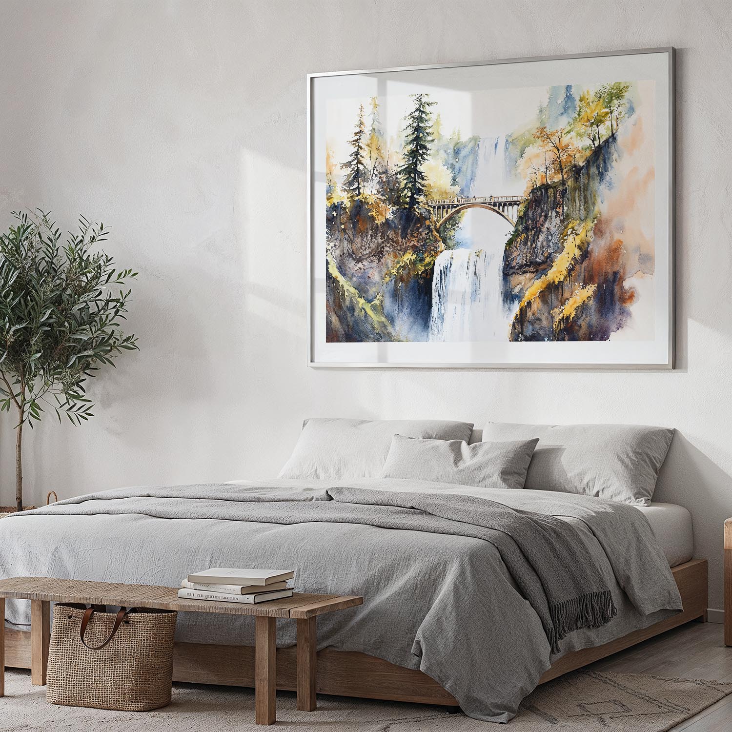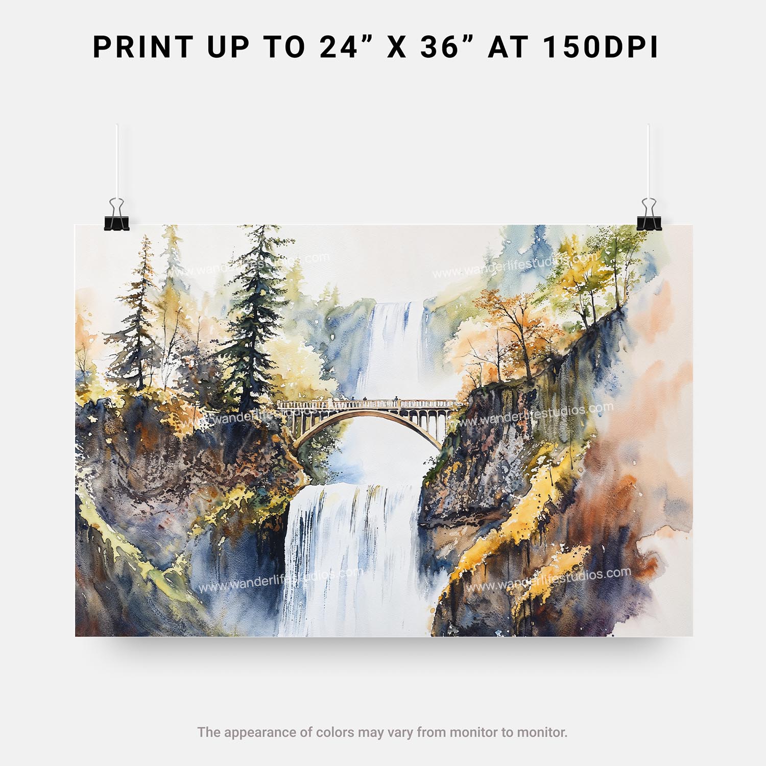 This watercolor captures the vibrant greens of the surrounding trees and the cool blues of the flowing water. The rich autumn hues bring warmth to the scene. Multnomah Falls, located in Oregon’s stunning Columbia River Gorge, has long been a favorite spot for travelers and locals alike.