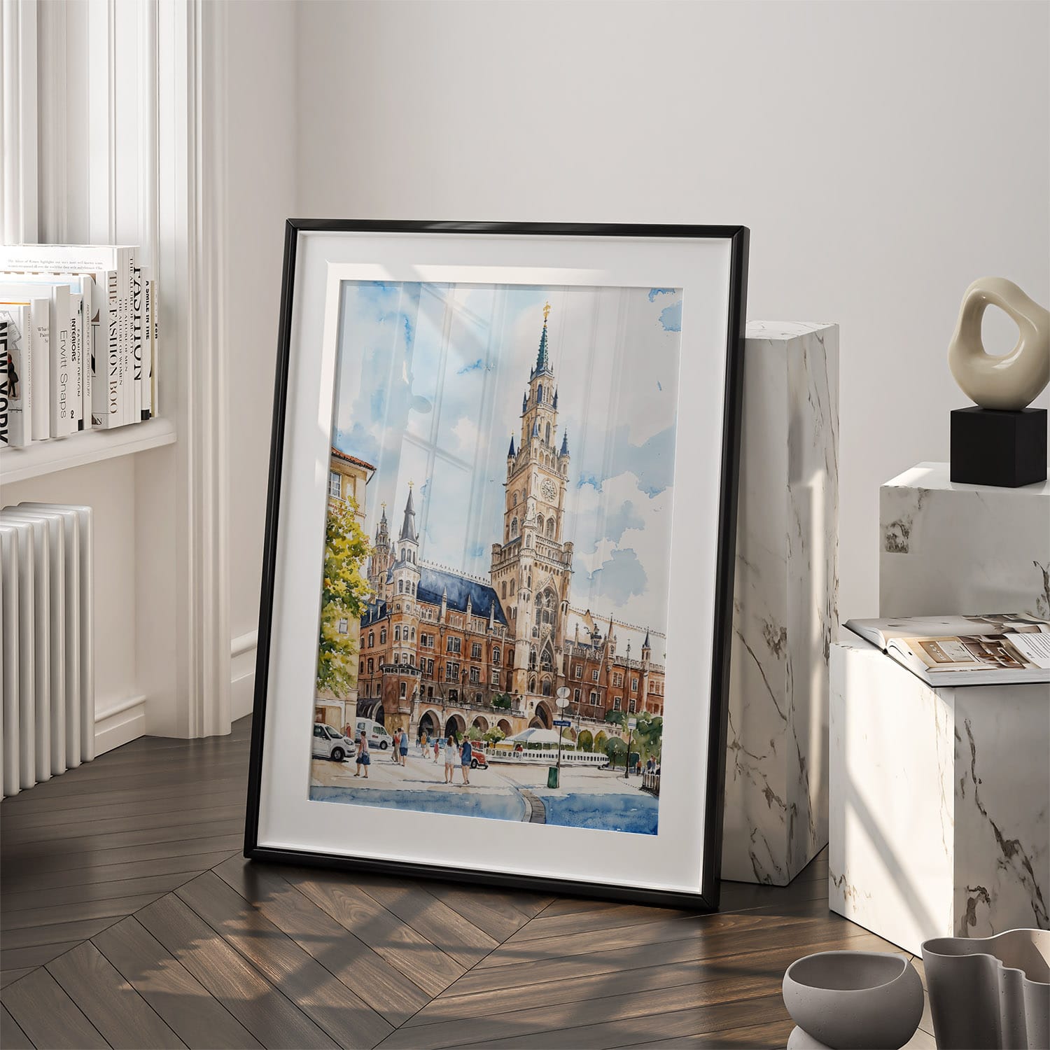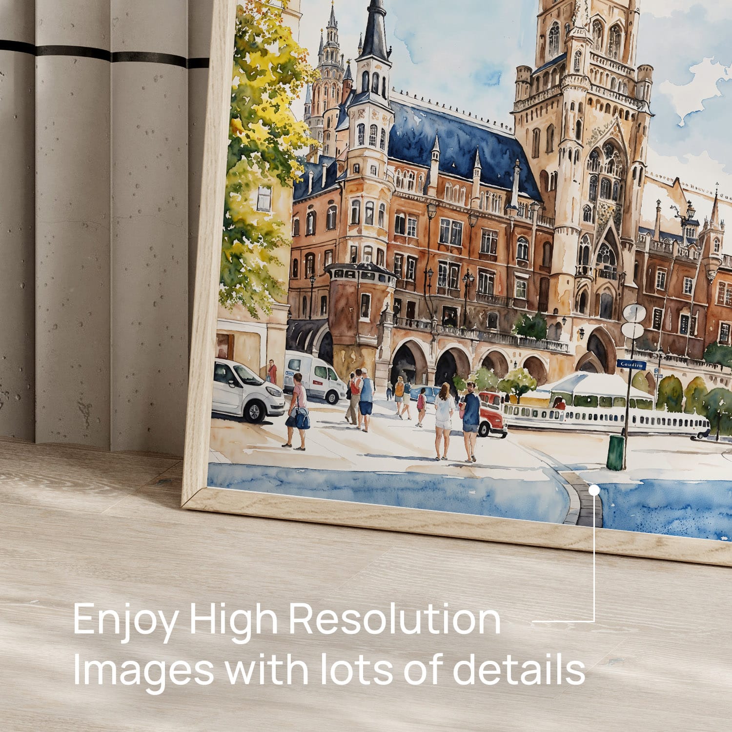 Munich Marienplatz Digital Download Wall Art – Watercolor Cityscape Design