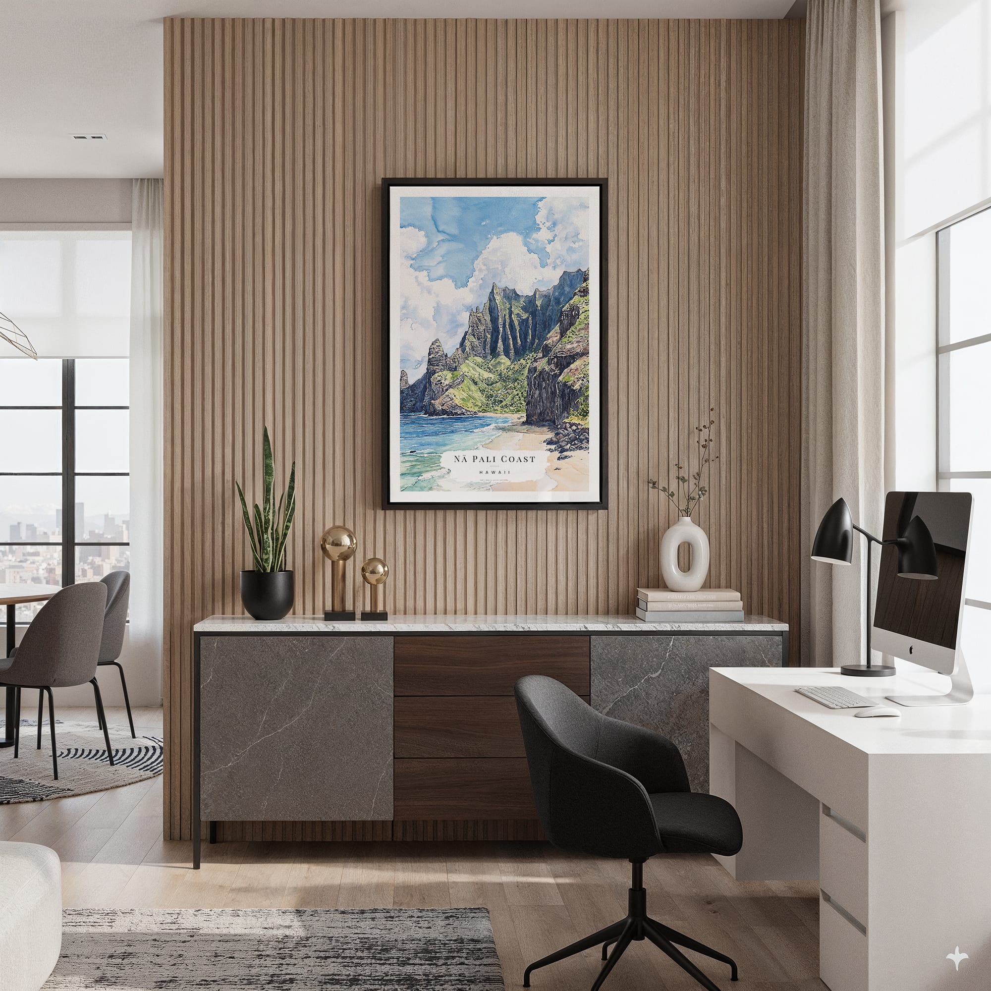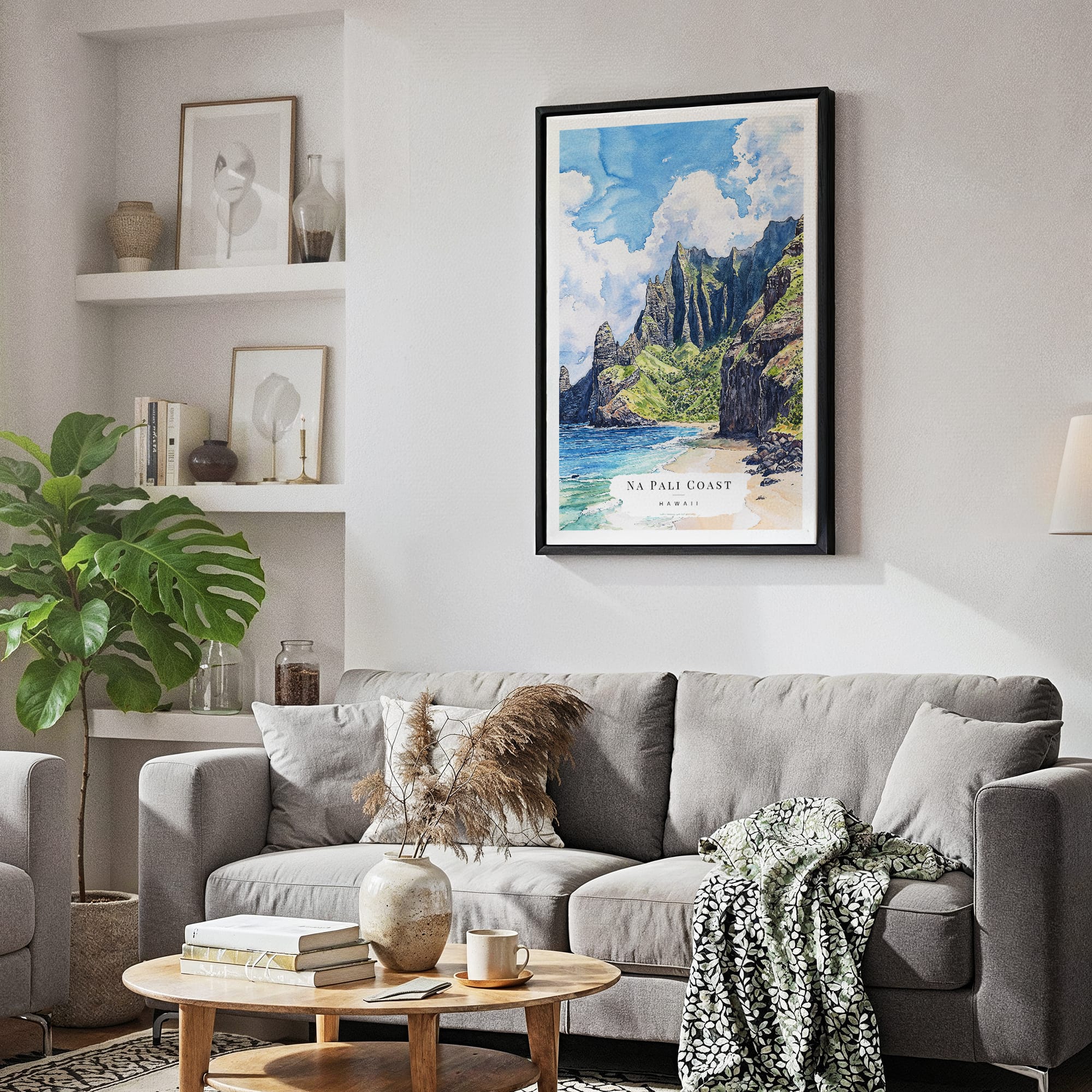 This artwork captures the breathtaking Na Pali Coast with rich greens and deep blue ocean hues, evoking a tranquil atmosphere. It’s perfect for creating an inviting feeling in living rooms or coastal-inspired spaces. Printed on gallery-wrapped canvas with fade-resistant inks, it is ready to hang and brings a touch of the Hawaiian paradise to your home. Whether for personal enjoyment or a special gift, it’s a refreshing addition to any decor.