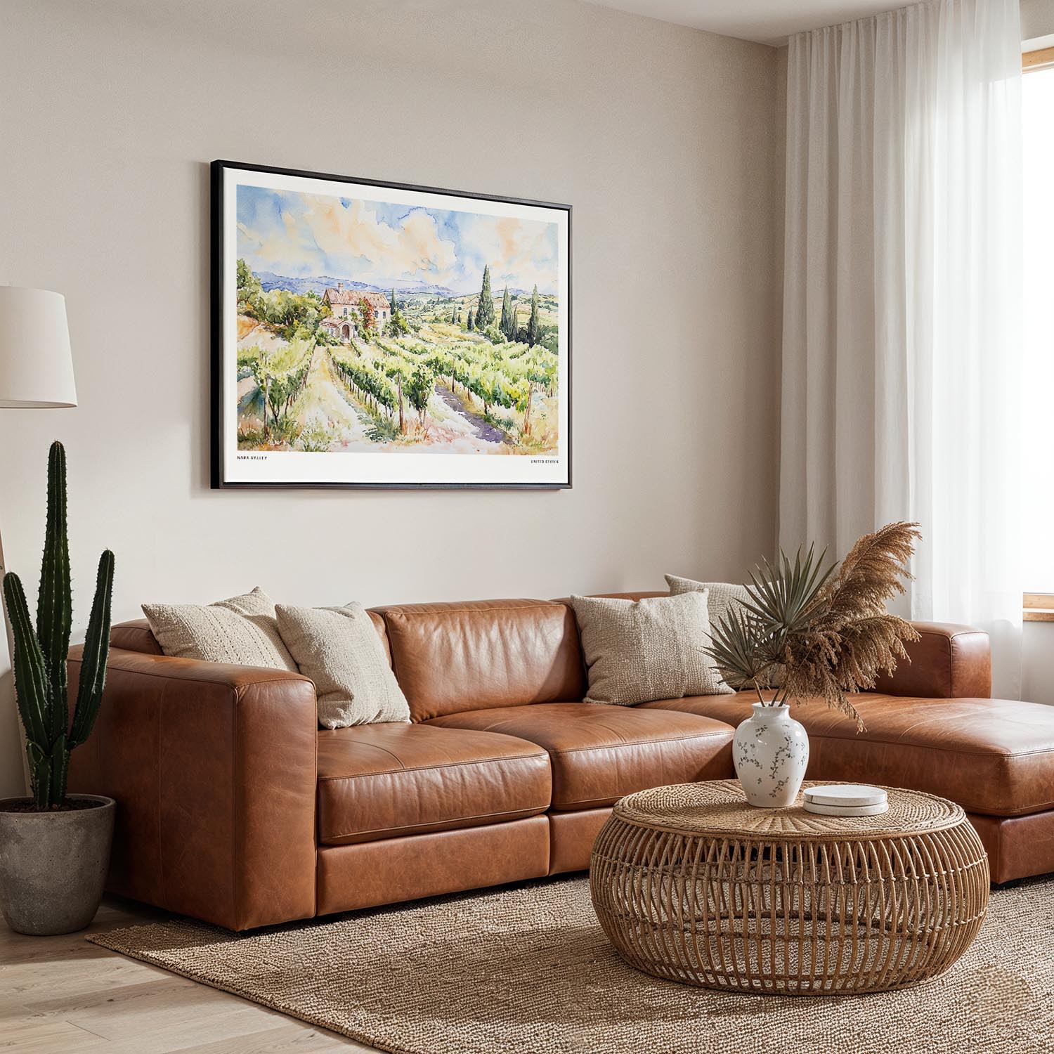 This canvas print captures the lush vineyards of Napa Valley in a soft watercolor style, showcasing rolling hills and a serene farmhouse. The inviting atmosphere it brings makes it an ideal addition to any space, creating warmth and relaxation. Crafted on hand-stretched canvas with fade-resistant inks, it arrives ready to hang, perfect for your living room, dining room, or office. A lovely choice for personal enjoyment or a thoughtful gift.