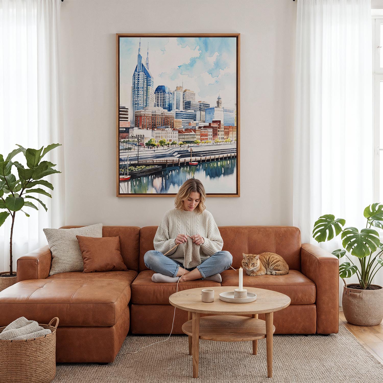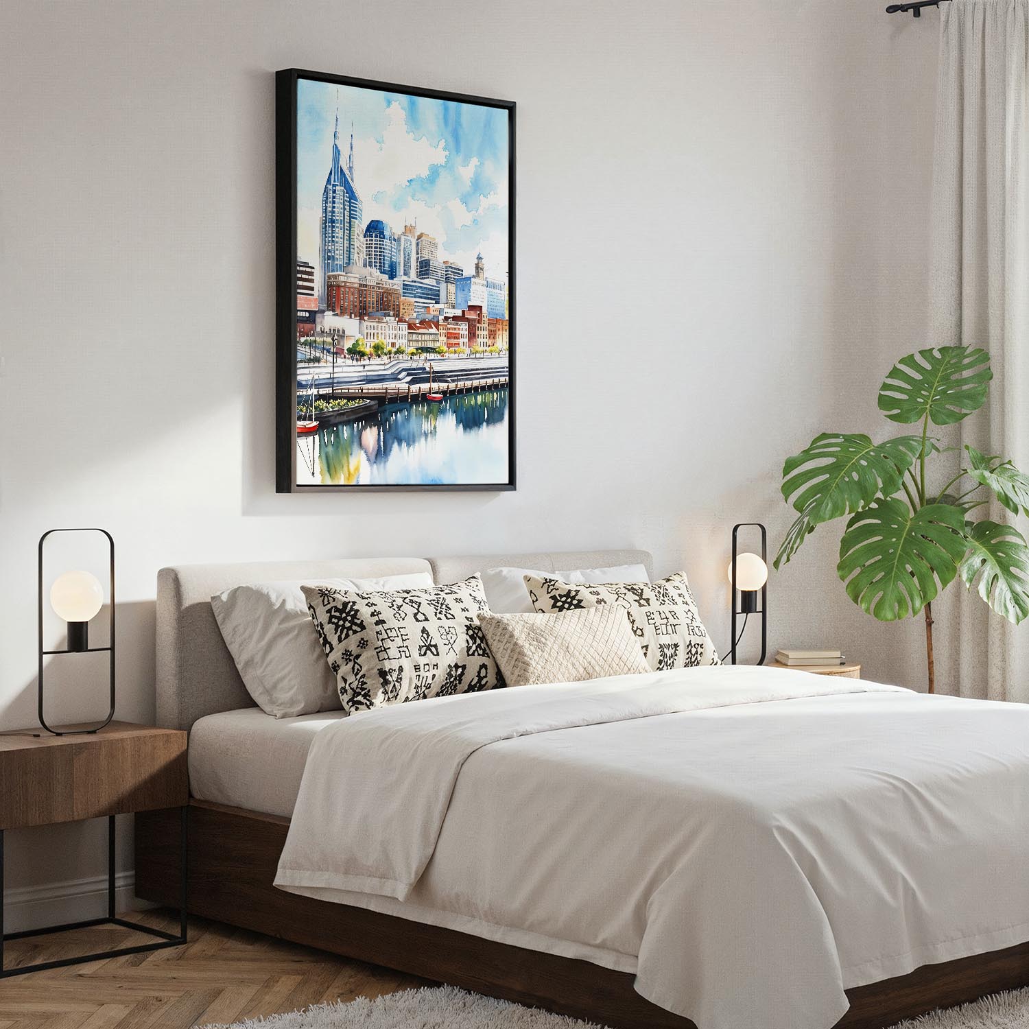 Experience the bustling spirit of Nashville through this watercolor canvas print. It beautifully showcases the city’s distinctive skyline, with its modern buildings and gentle reflections on the water, inviting a sense of urban energy into your home.