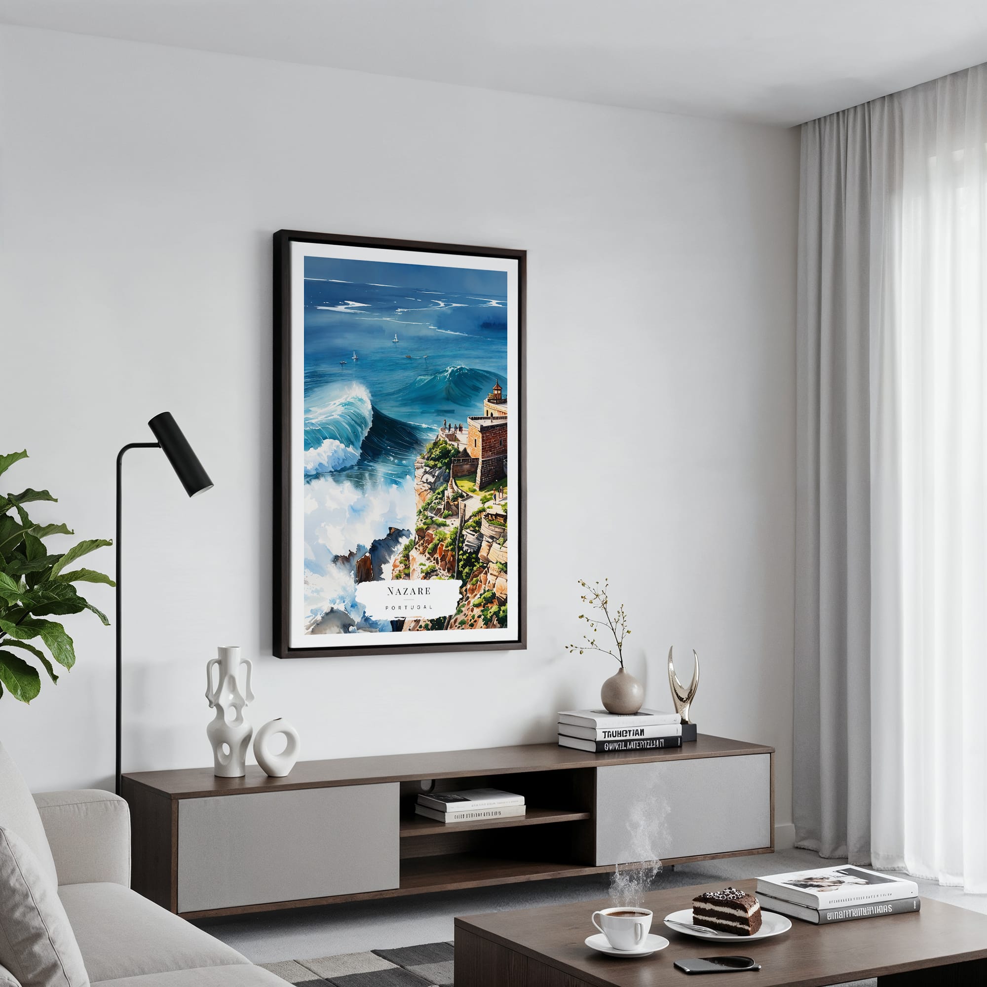 This Nazare canvas art print features vibrant blues and greens depicting the dynamic waves and coastline. It’s a wonderful addition to any room and easy to hang, bringing a touch of Portugal’s charm to your space.