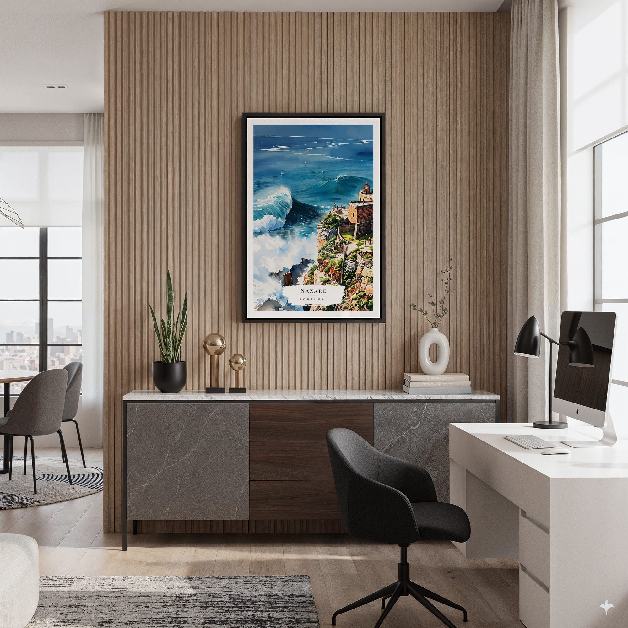 This artwork showcases the stunning waves and dramatic coastline of Nazare, Portugal, rendered in rich watercolors. The lively blues and greens create an inviting atmosphere, perfect for enhancing your living room or office. Printed on quality canvas with fade-resistant inks, it arrives ready to hang, making it a versatile option for anyone looking to refresh their decor. Enjoy this piece as a personal treasure or gift it to someone who appreciates the beauty of the ocean.