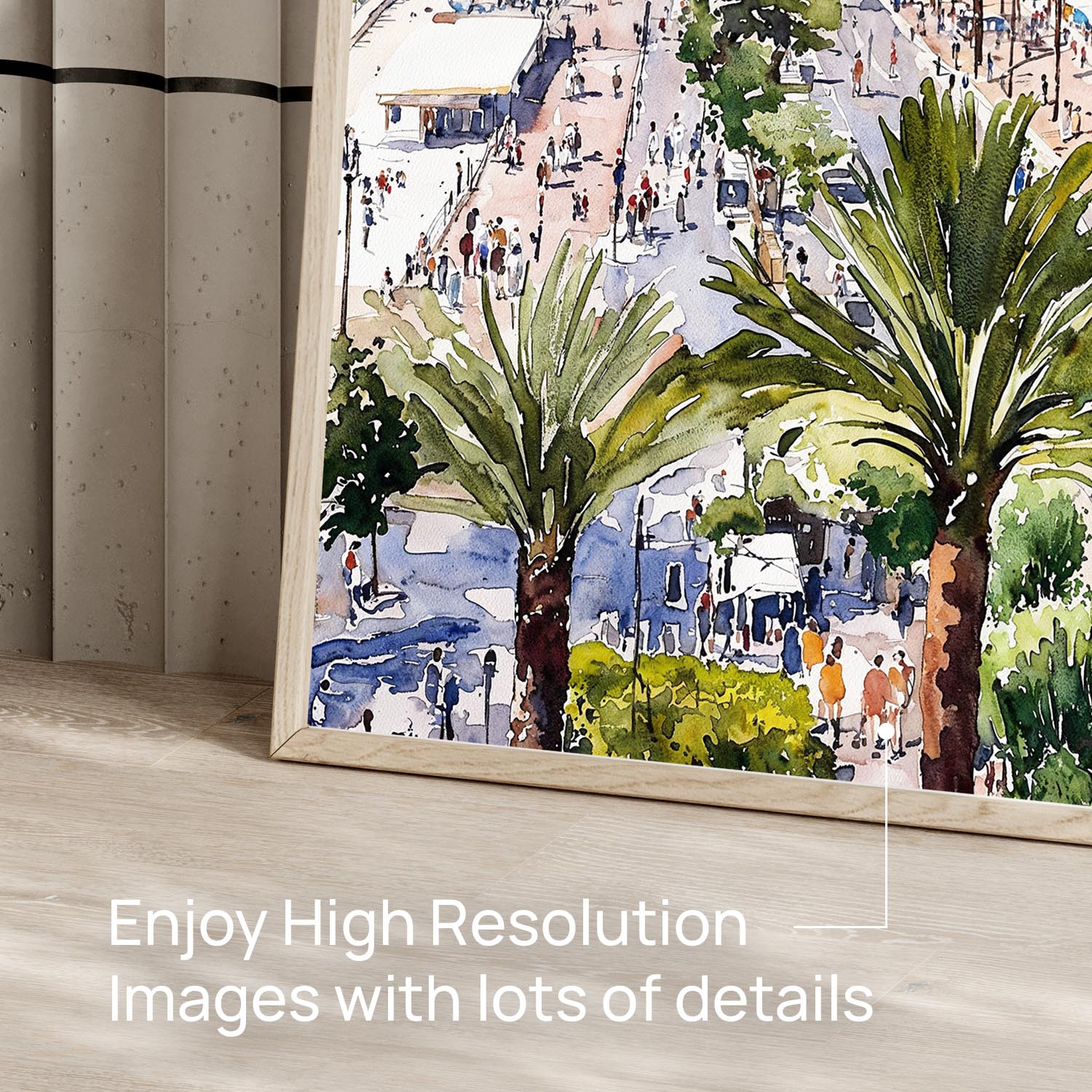 Experience the charm of the French Riviera with this beautiful watercolor showcasing the stunning coastline of Nice. This artwork captures the lively atmosphere of palm-lined promenades, sunlit buildings, and the soothing blue of the sea, inviting a sense of warmth and joy into your home.