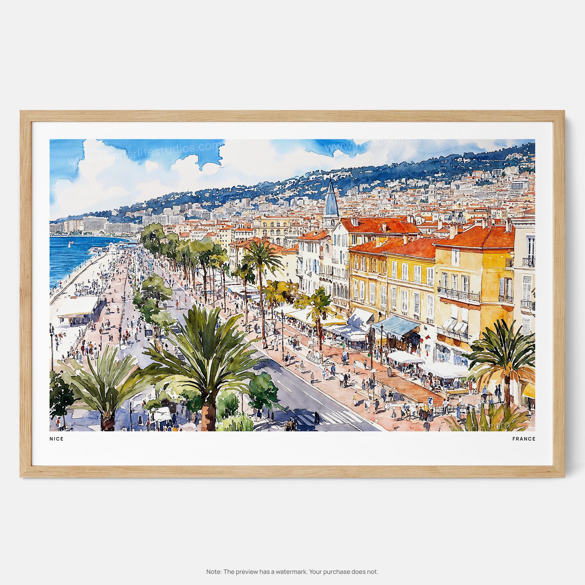 Bring the vibrant energy of Nice, France, into your home with this watercolor art print. Perfect for brightening up a living room, bedroom, or office space.