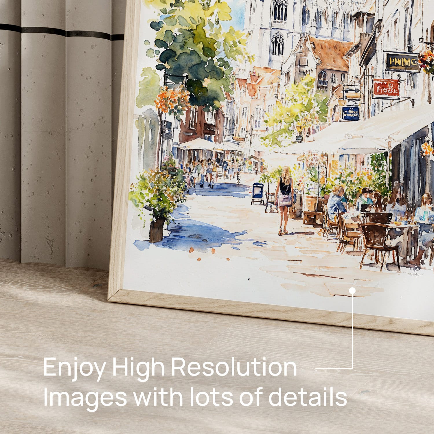 Enjoy the picturesque charm of Norwich, England with this watercolor digital download wall art. Its vibrant colors and inviting scene are perfect for instant printing and easy display in any home or office space.