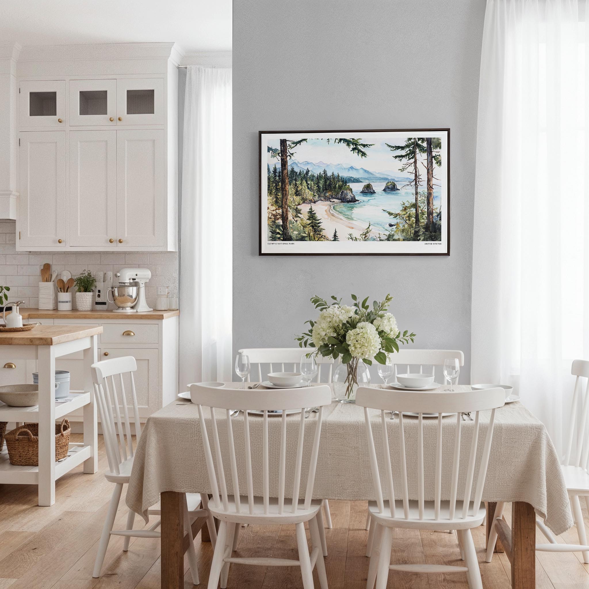 This canvas print showcases the stunning coastline of Olympic National Park, featuring lush forests and rocky shores through soft watercolor washes. The artwork evokes a sense of calm and connection with nature, making it an inviting addition to your home. Printed on durable canvas with fade-resistant inks and securely stretched over solid wood bars, it arrives ready to hang. Ideal for living rooms, offices, or any space that deserves a touch of the great outdoors, it also makes a thoughtful gift for nature lovers.