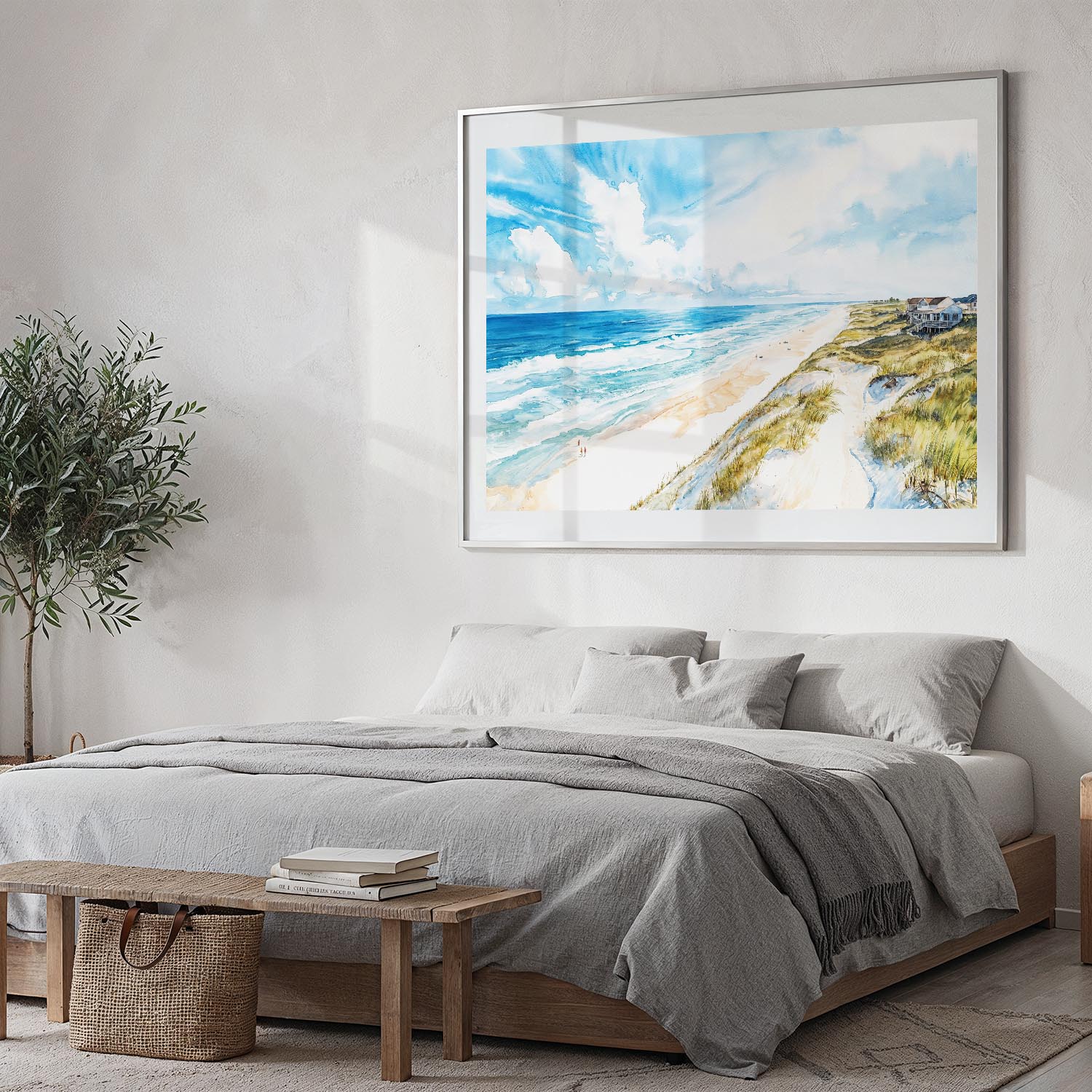 Capture the essence of the Outer Banks with this coastal watercolor digital download wall art. Its serene beach scene invites you to print and enjoy it instantly in your home or office.