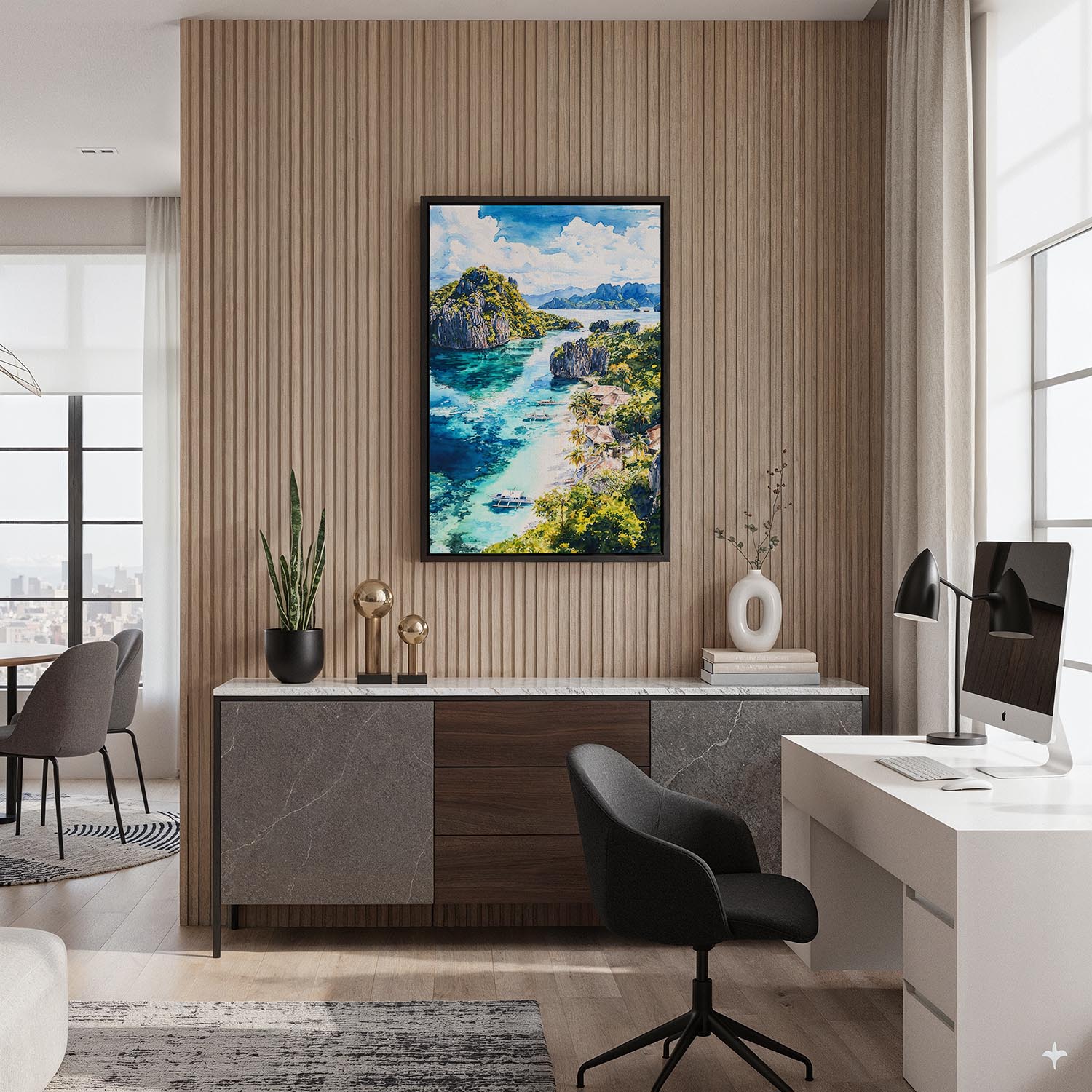 The enchanting shores of Palawan come alive in this vibrant watercolor canvas print. It captures the lush green landscapes and clear turquoise waters, inviting a sense of tranquility into your space.