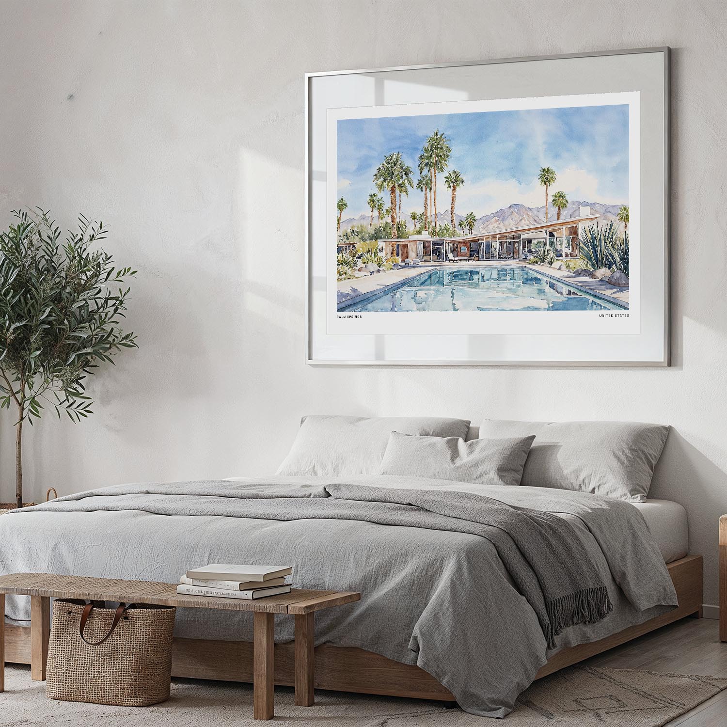 Bring the charm of Palm Springs into your home with this watercolor art print. Featuring a serene poolside scene surrounded by palm trees, it’s a lovely addition to any living space or office.