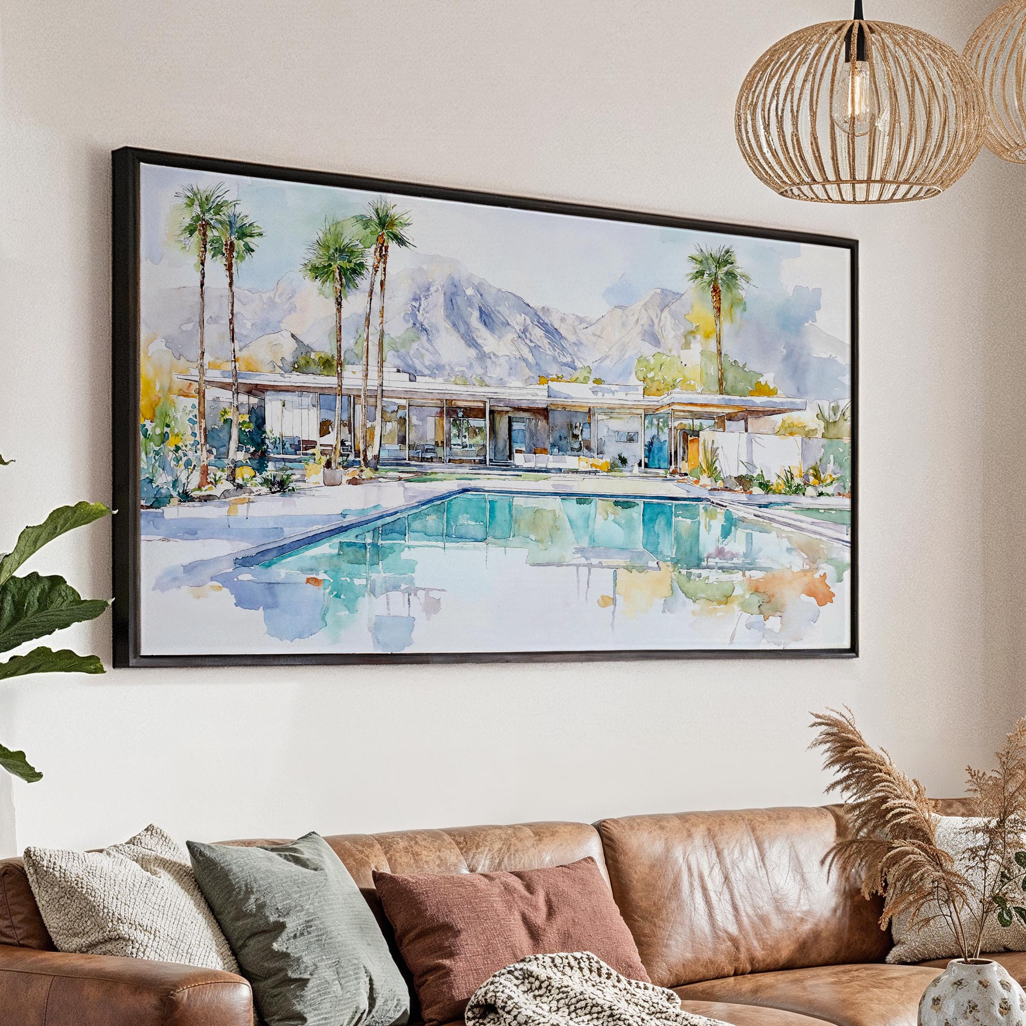 Palm Springs Watercolor Panorama Canvas Print – Midcentury Poolside Landscape