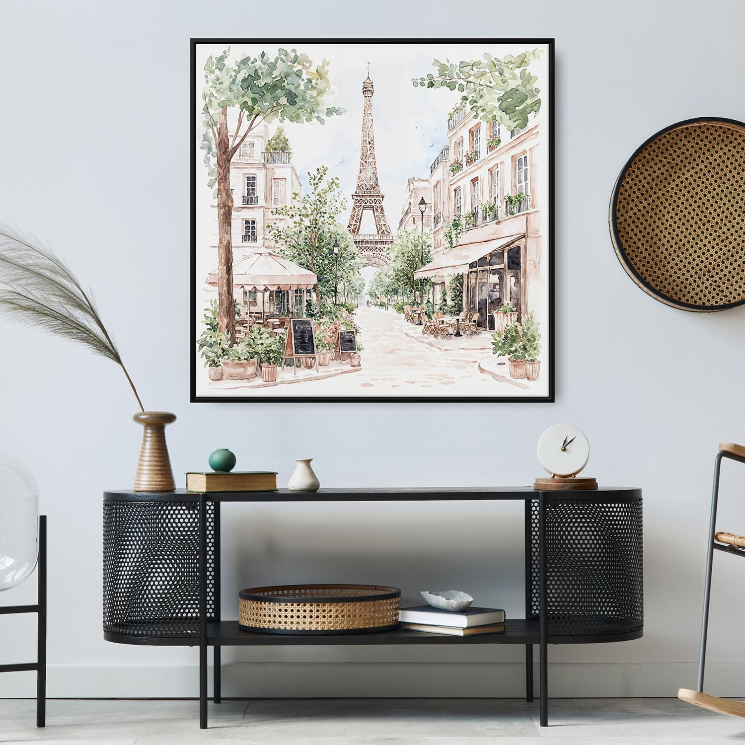 This square canvas print beautifully showcases a quaint Parisian café nestled under the Eiffel Tower. The 1:1 ratio enhances the artwork’s visual appeal, transforming your room with its elegance and charm. Crafted from premium materials, it features a hand-stretched canvas on solid wood stretcher bars and is printed with fade-resistant inks. Ideal for hanging above sofas, in hallways, or offices, this piece brings a slice of Paris to your everyday life, whether for personal enjoyment or as a thoughtful gift.