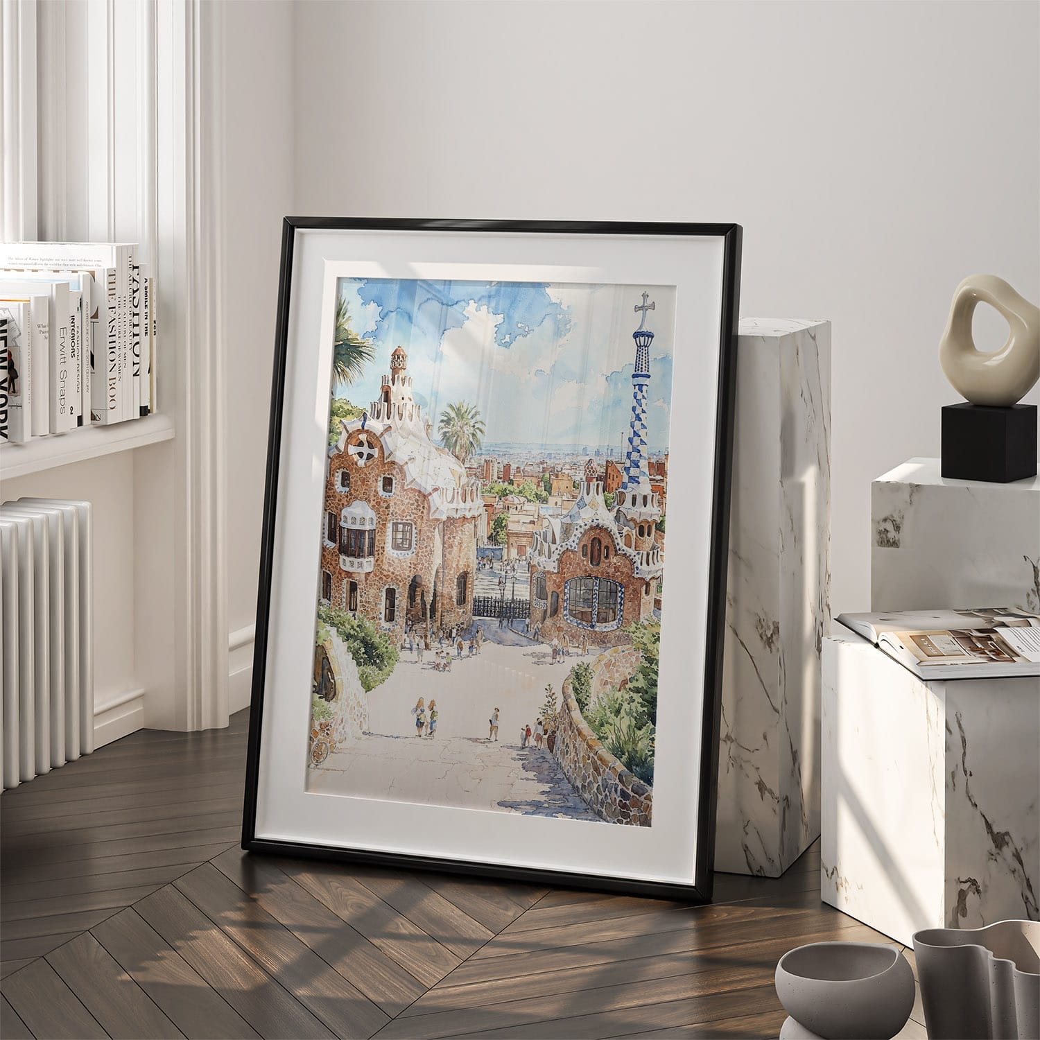 Park Güell Watercolor Art Print – Vibrant Digital Download of Barcelona’s Iconic Landmark