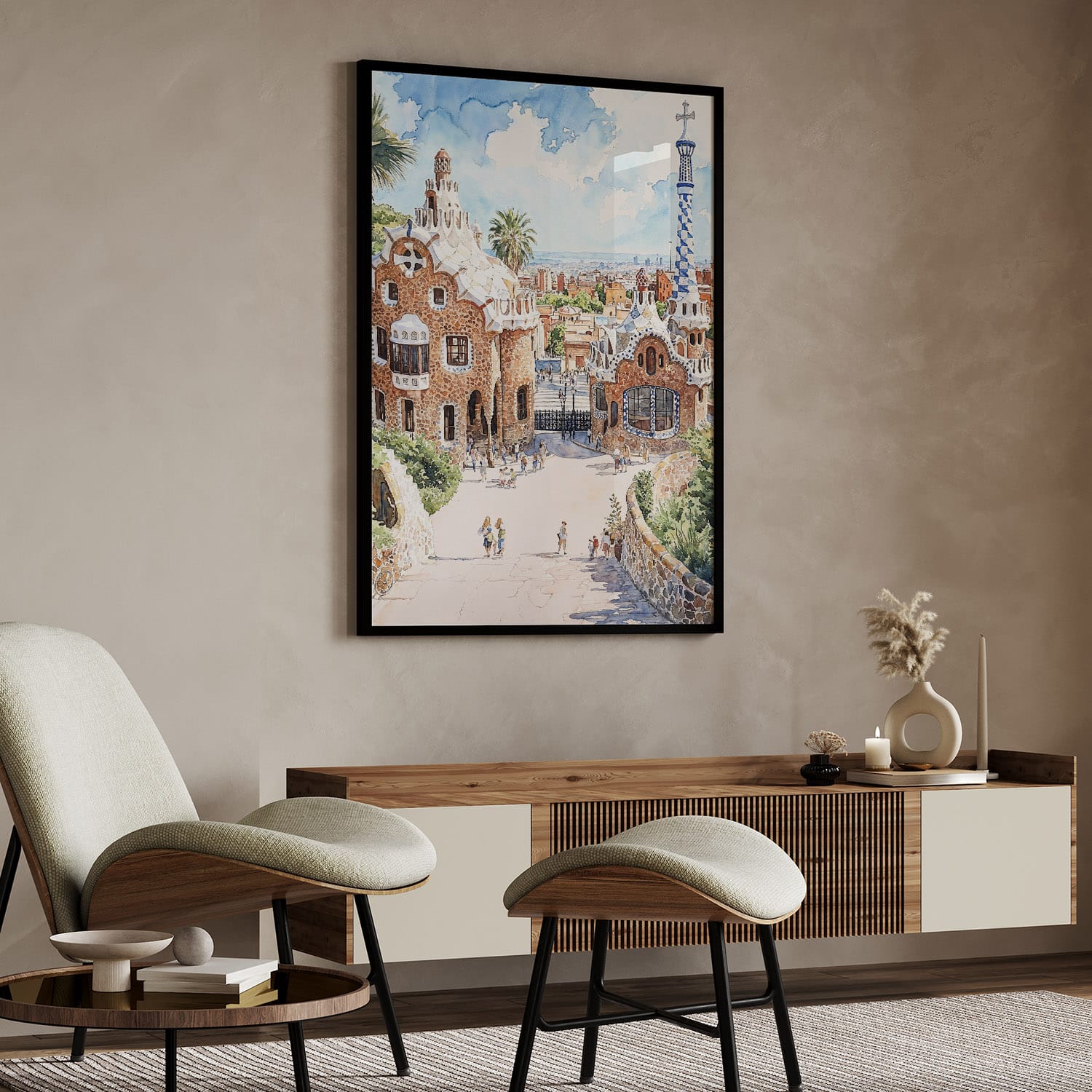 This digital download wall art captures the essence of Park Güell with warm hues and whimsical architecture. Instantly available and easy to print, it brings a touch of Barcelona charm to your walls.