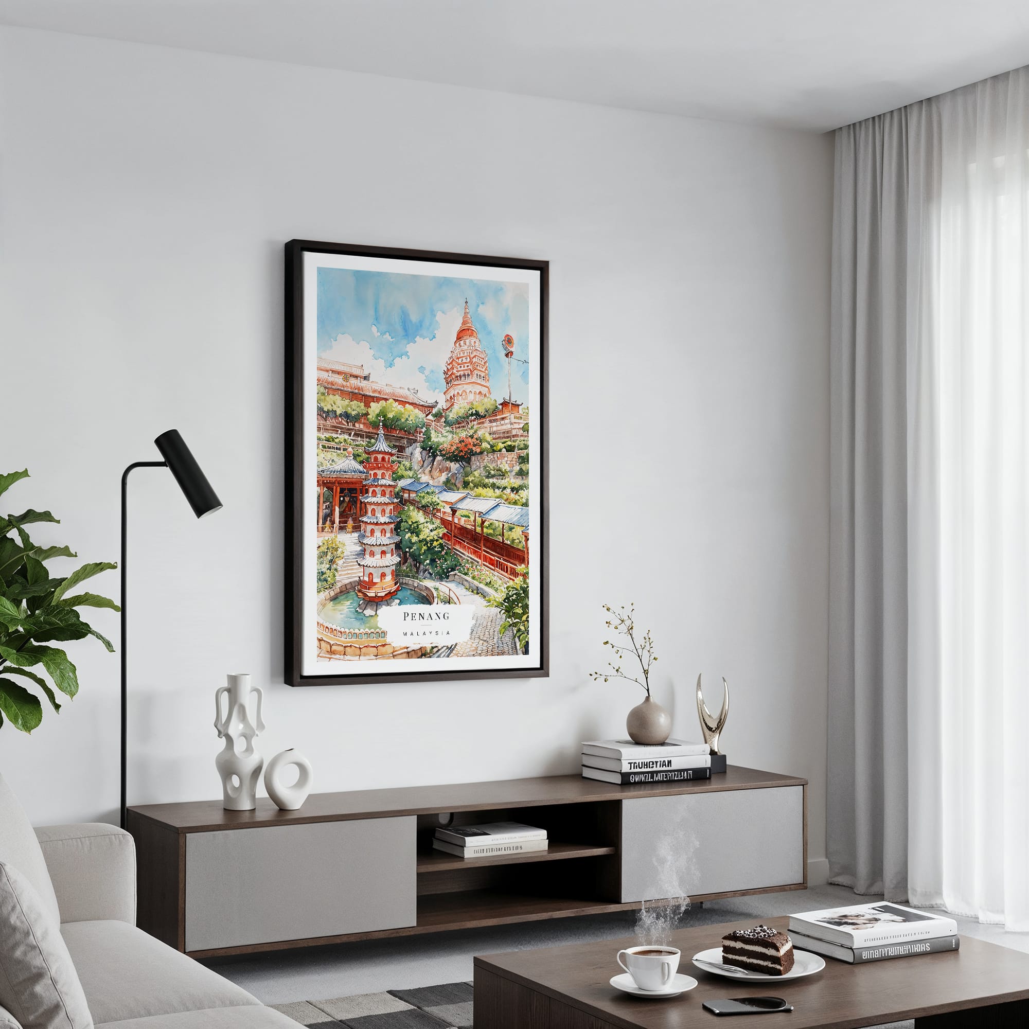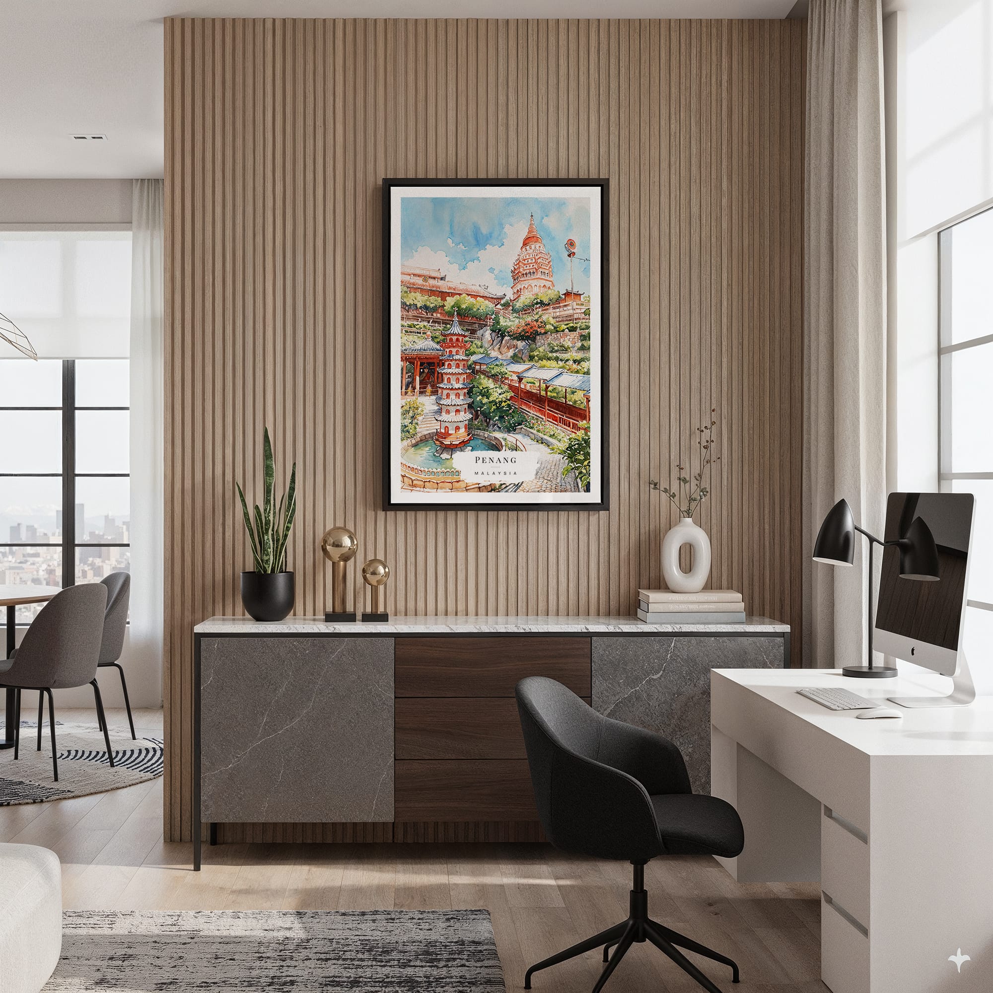 This artwork captures the essence of Penang with gentle hues and intricate details that evoke tranquility. Its calming aesthetic enhances various rooms, from living areas to home offices. Printed on high-quality canvas with fade-resistant inks and a matte finish, it arrives ready to hang. This piece invites personal enjoyment or makes for a thoughtful gift for travelers and lovers of cultural art.