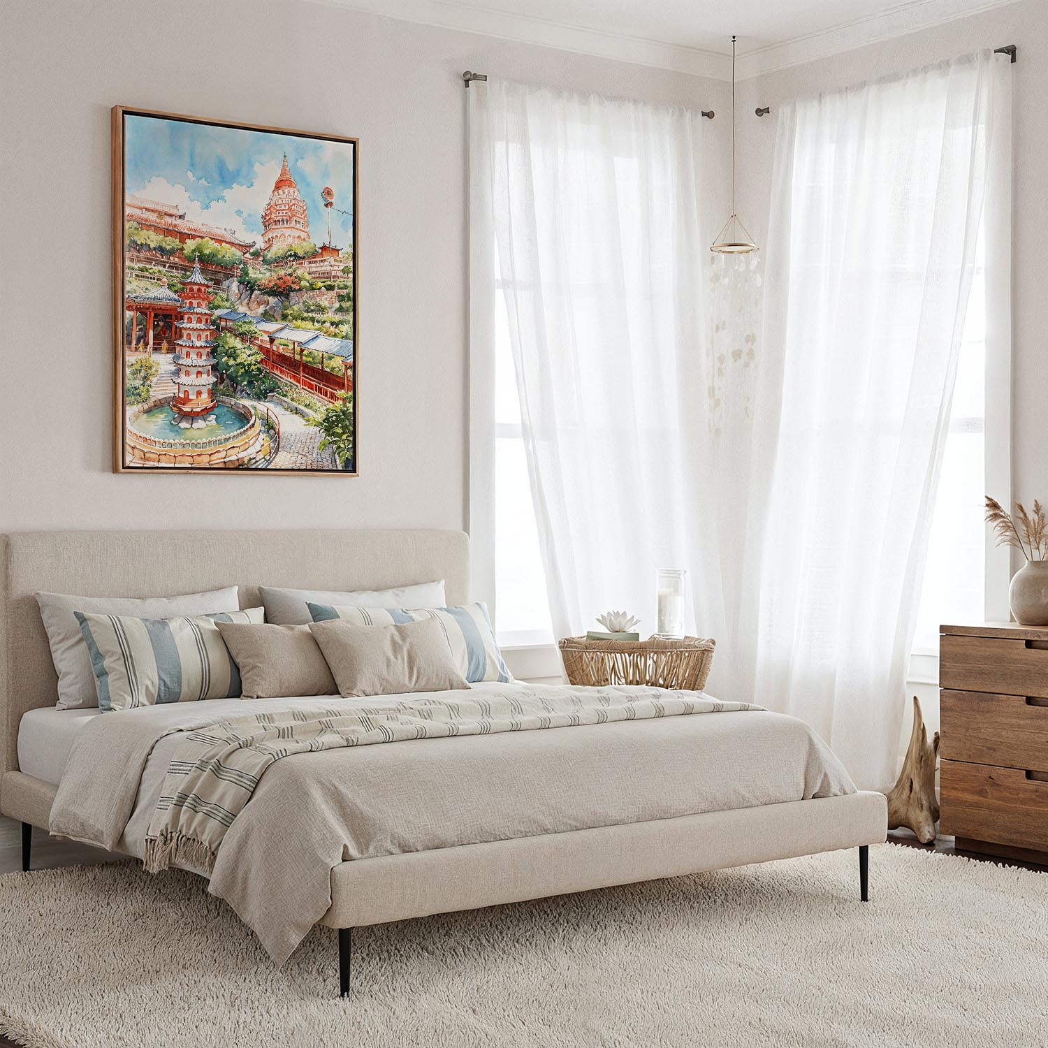 Experience the rich culture of Penang with this stunning watercolor canvas print. It showcases the unique architecture and lush greenery that define this Malaysian gem, evoking an atmosphere of warmth and vibrancy.