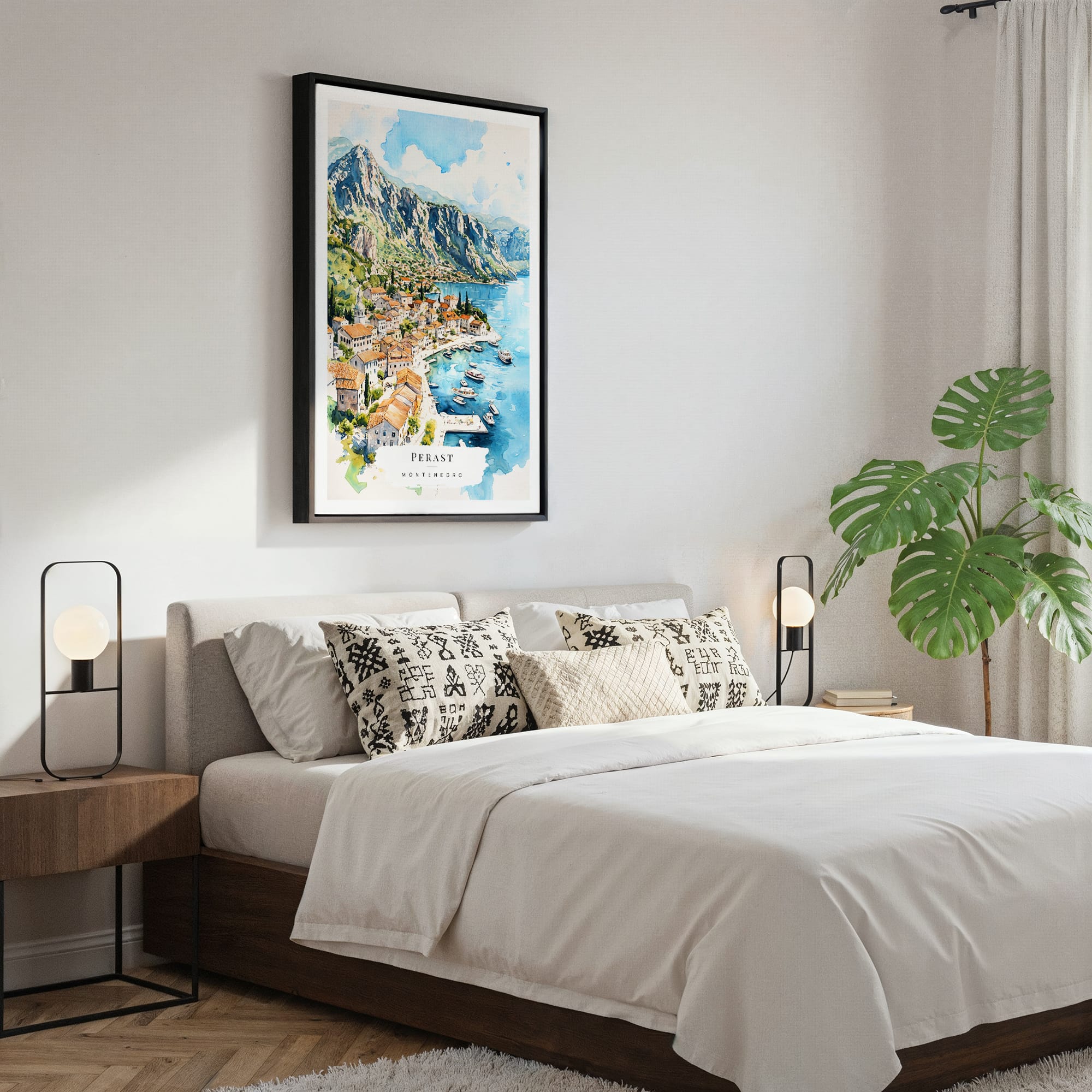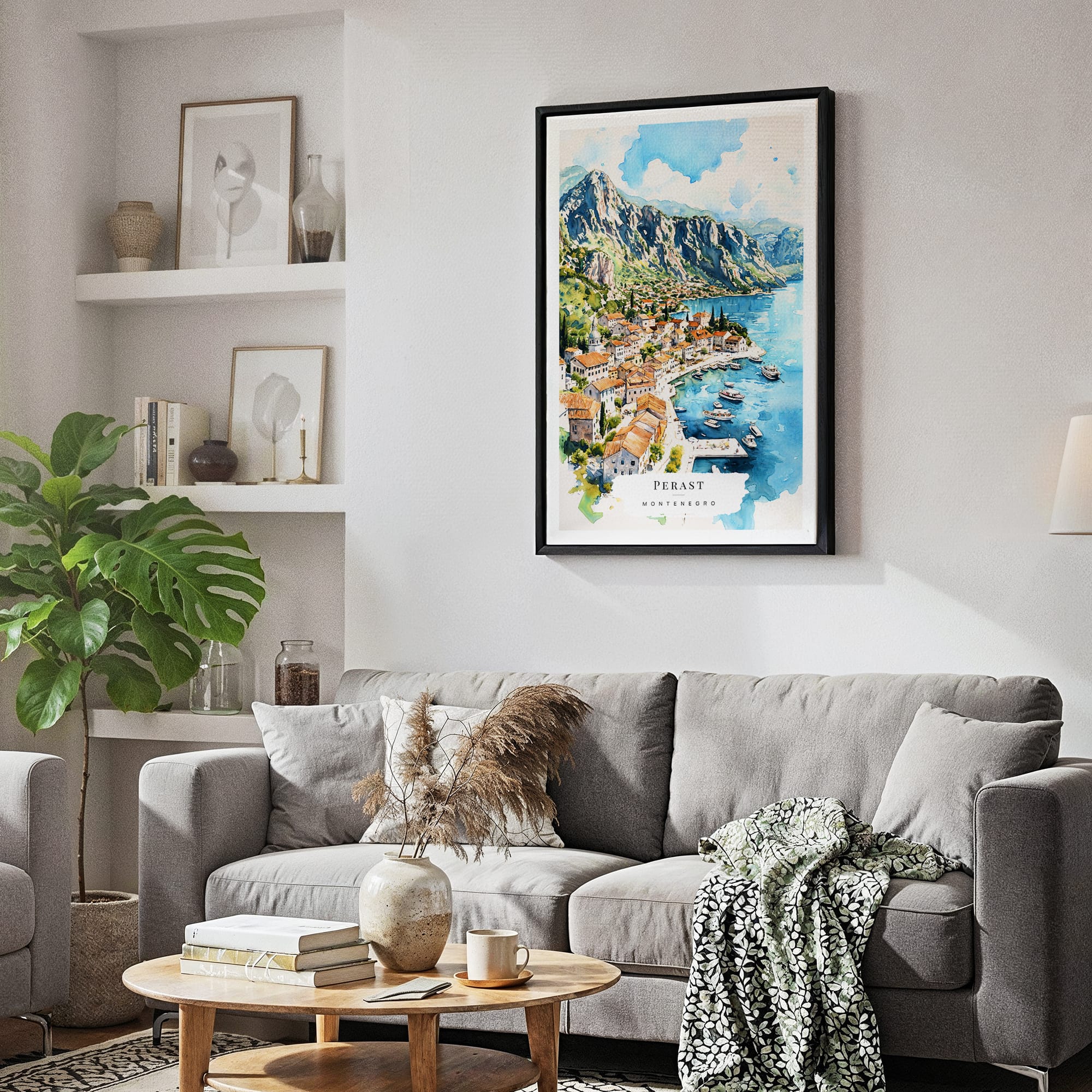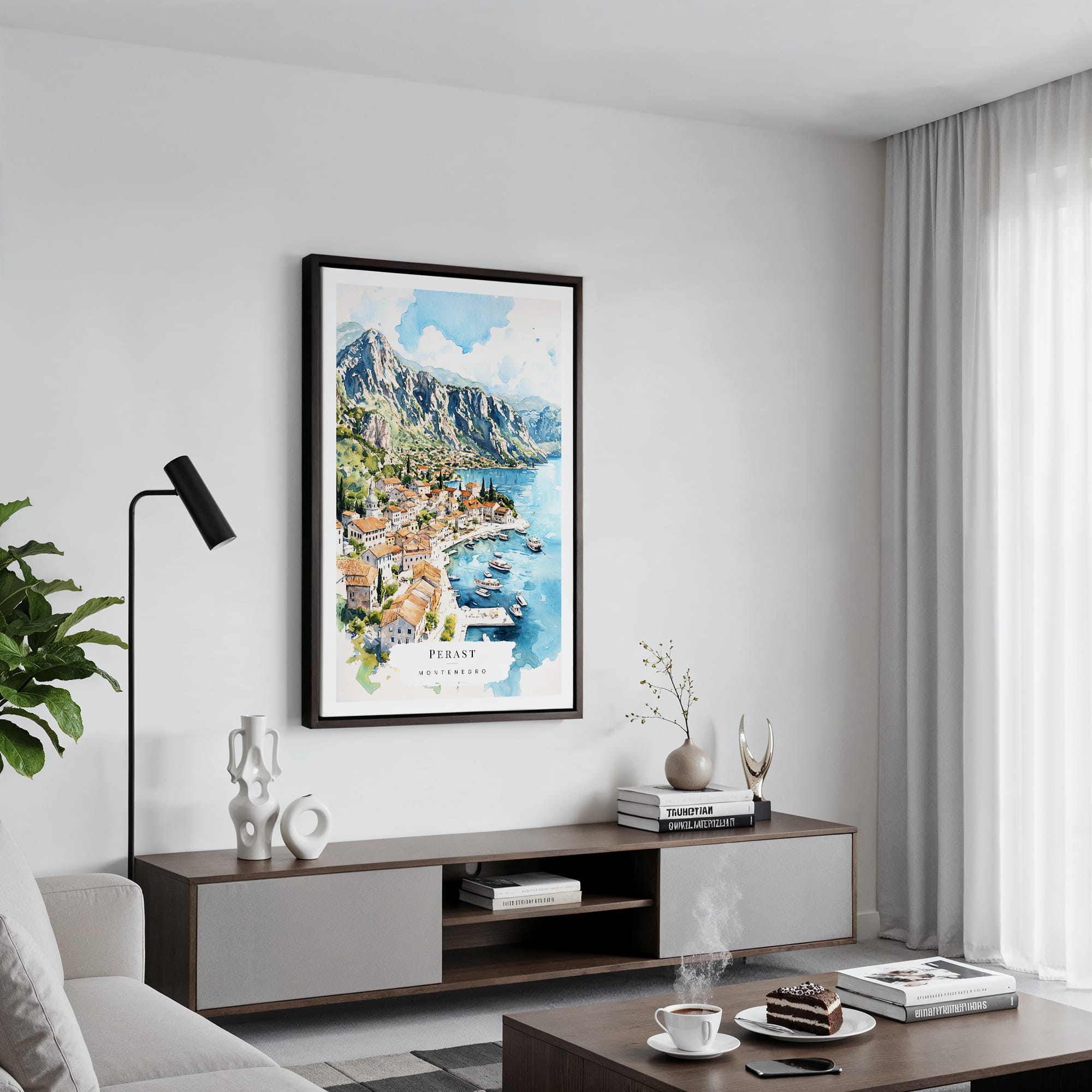 Perast Montenegro Watercolor Canvas Print – Charming Coastal Landscape Wall Art