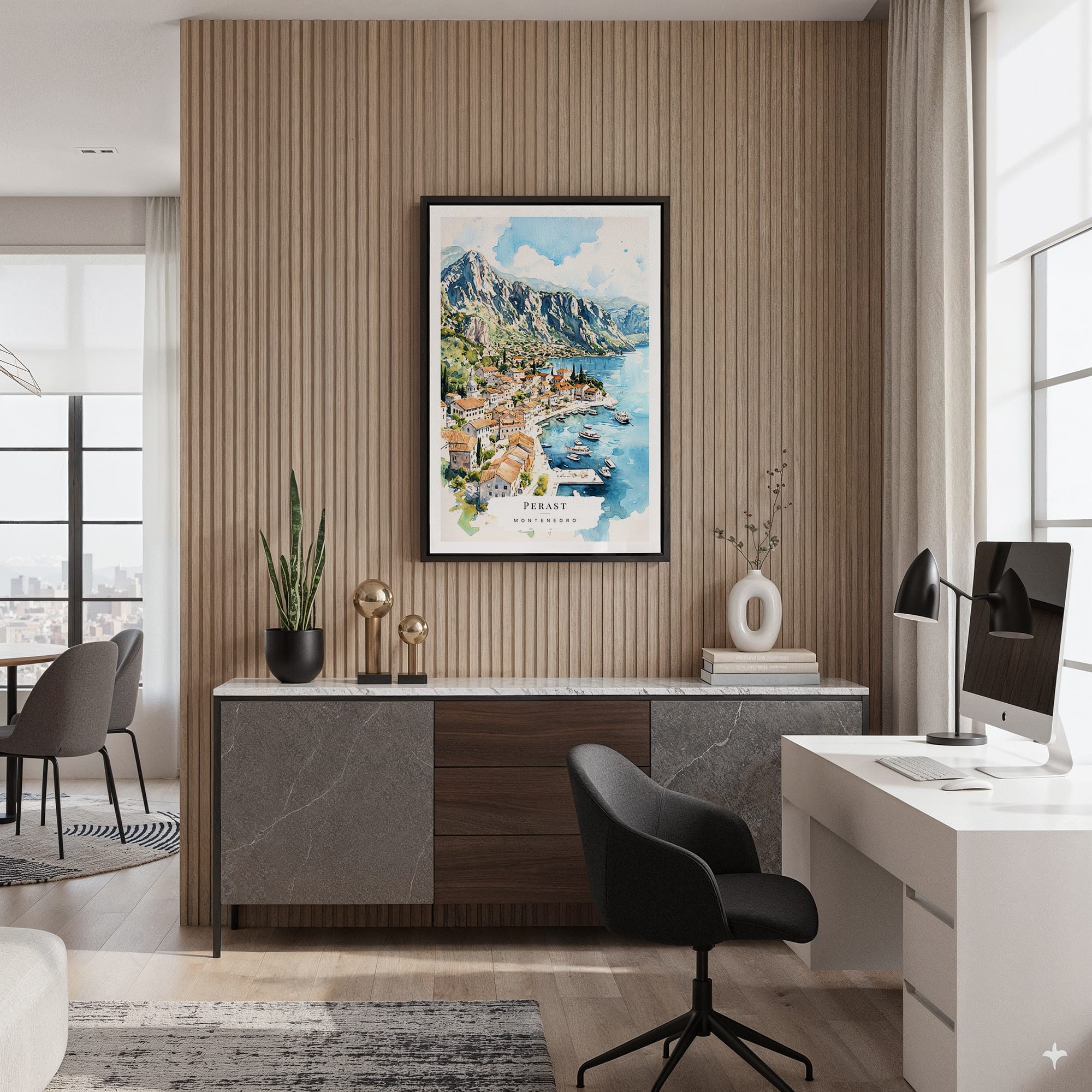 This artwork showcases the idyllic coastal village of Perast with soft blues and cheerful architecture, creating a relaxed atmosphere in your home. Ideal for living rooms, bedrooms, or workspaces, it brings a touch of Mediterranean charm to any room. Crafted on high-quality canvas with fade-resistant inks, it arrives ready to hang, making it a delightful gift for those who appreciate beautiful landscapes or a perfect personal touch for your decor.
